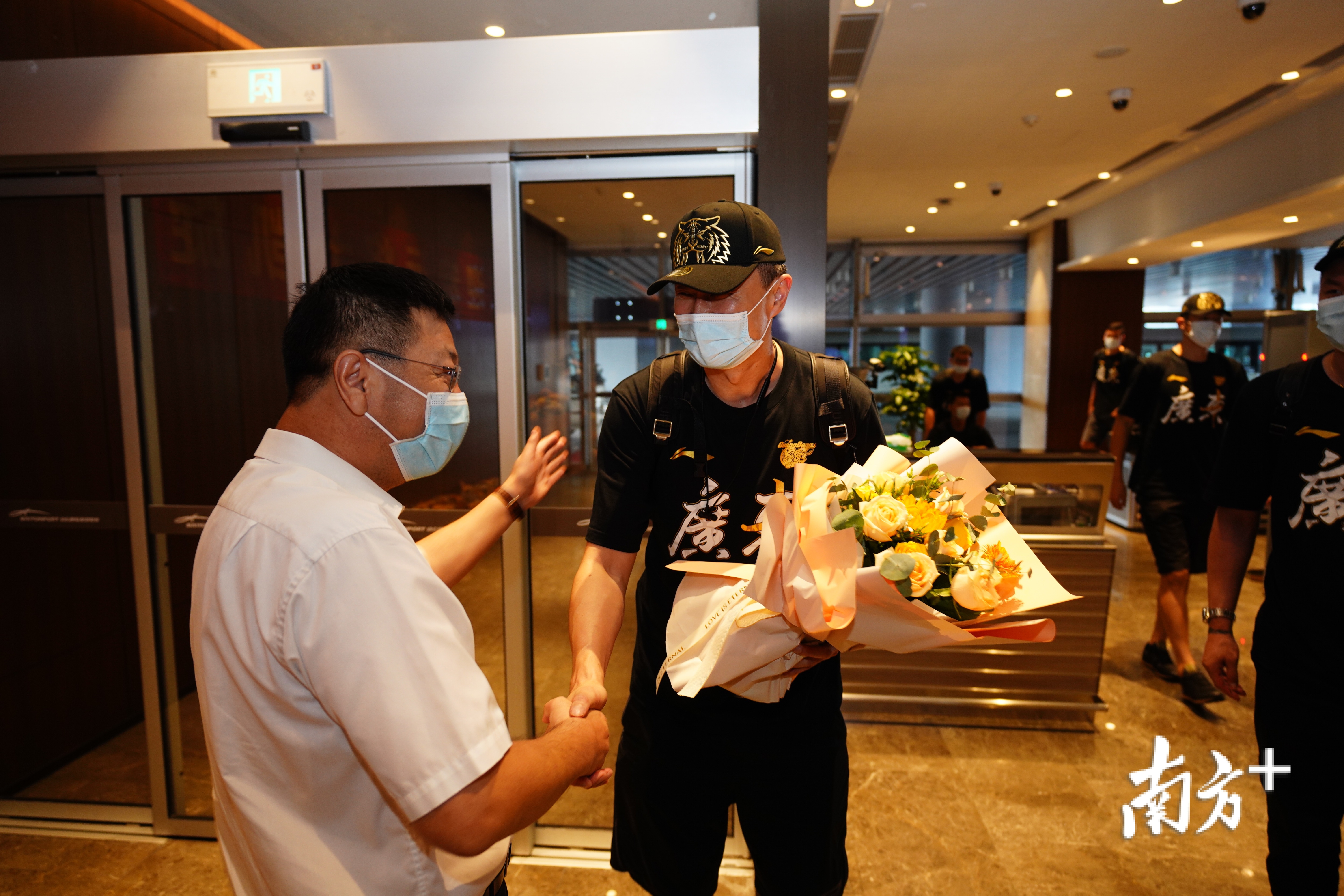 16日广东队从青岛飞抵广州白云机场,南方+记者随同东莞市有关部门负责人一行抵达机场,迎接英雄凯旋。