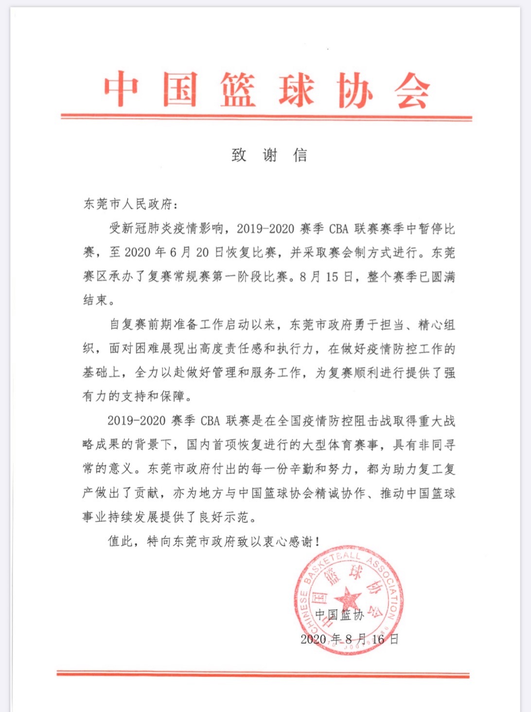 “东莞市政府付出的每一份辛勤和努力,都为助力复工复产做出了贡献。”中国篮协在致谢信中道。
