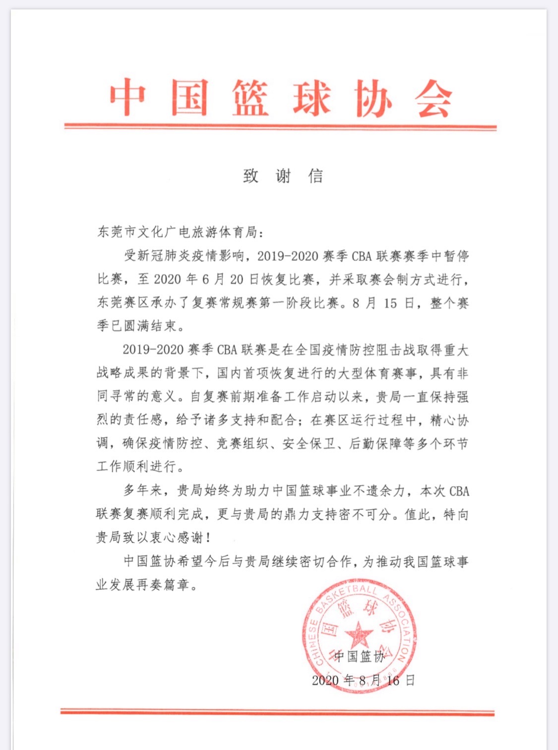 “多年来,贵局始终为助力中国篮球事业不遗余力,本次CBA联赛复赛顺利完成,更与贵局的鼎力支持密不可分。值此,特向贵局致以衷心感谢!”