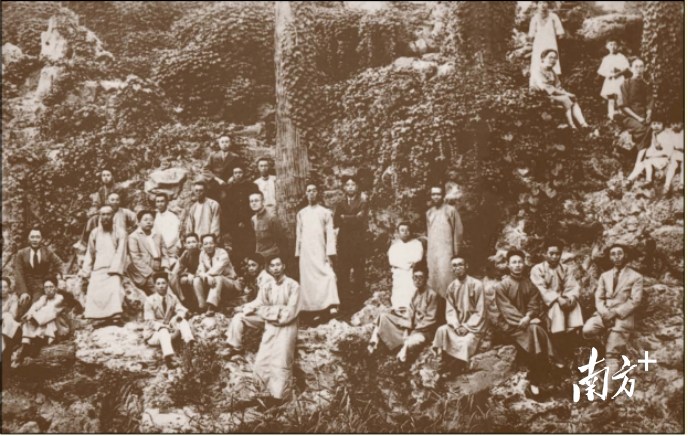 这是一张拍摄于1929年秋季的老照片,记录了当时中央研究院历史语言研究所的部分成员。其中的人物或穿西服,或着长衫,摆着略显随意的姿势,背后是北海静心斋的假山奇石。