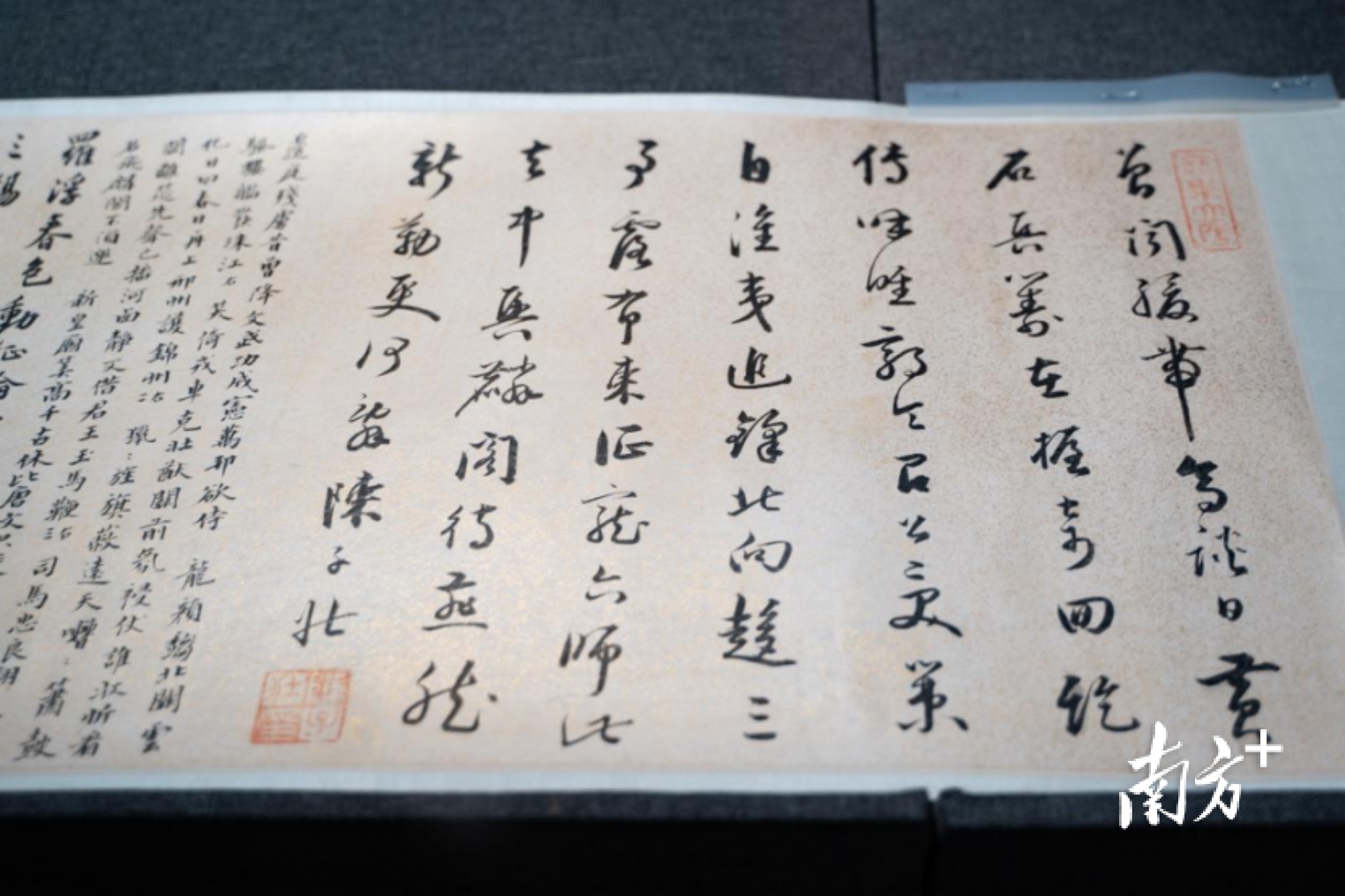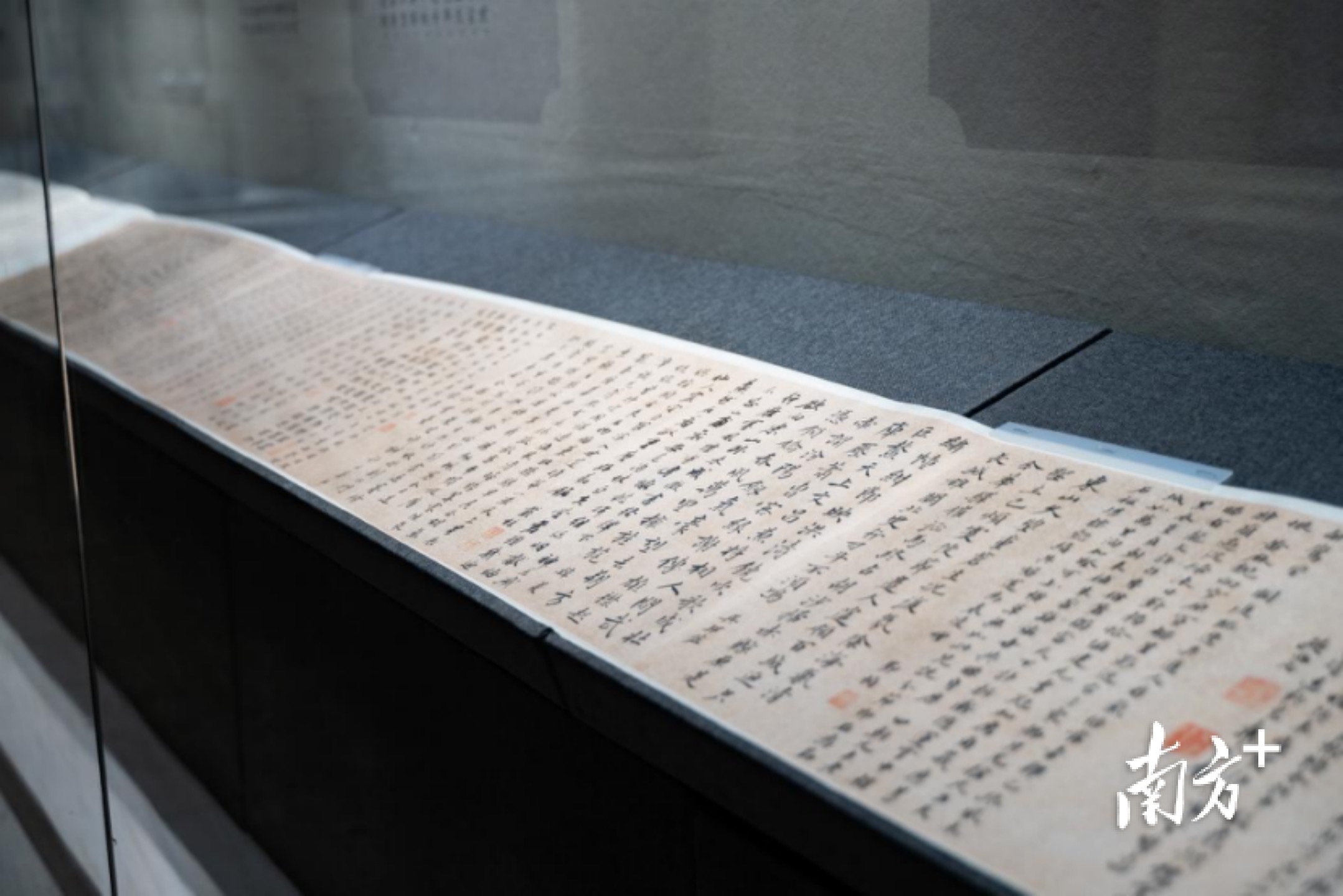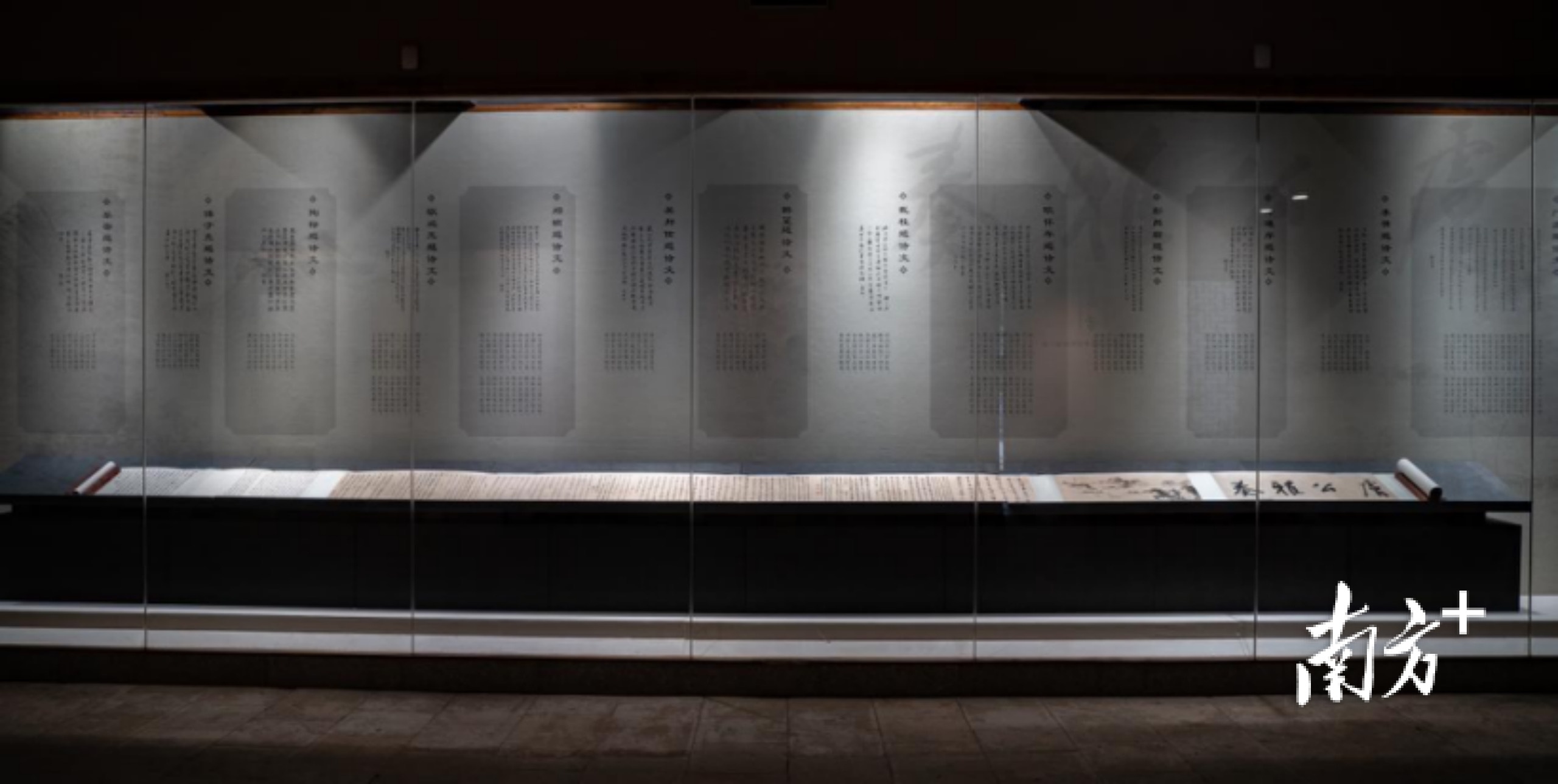 此前,此卷一直藏于广东省博物馆,作为一幅为送别袁崇焕而作的画卷,本次是首次来到东莞展出。展览围绕《肤公雅奏图》展开,从画卷背景、诗画解析、人物关系、后世流传等四个方面展开了介绍。