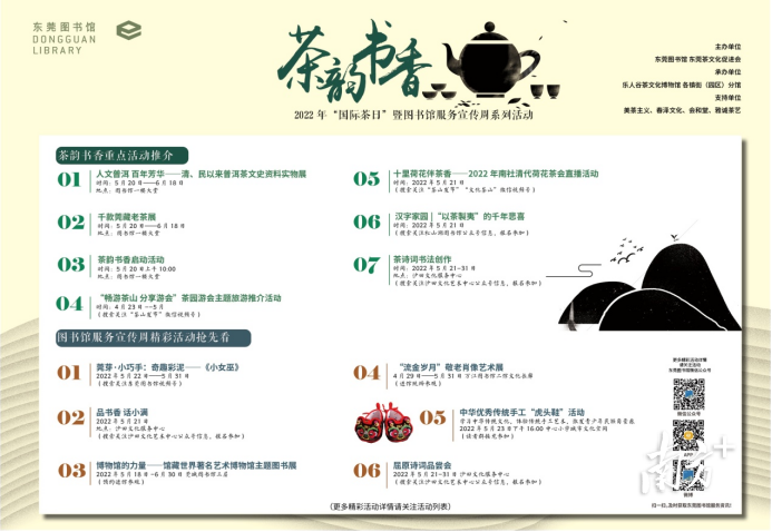 今年“国际茶日”及5月 “图书馆服务宣传周”到来之际,东莞图书馆将联合东莞茶文化促进会、乐人谷茶文化博物馆和各镇街(园区)分馆,采取线上线下结合,特色主题馆牵头,市镇各方联动,举办包括“国际茶日”和图书馆服务宣传周两大主题,涵盖茶文化展览、主题讲座、茶艺展示,茶道体验、游园研学、主题书目推荐和少儿活动等七大系列共计100余项特色活动,搭建以茶为媒,以书会友的活动平台,邀请广大读者共品茶香书韵,共享美好生活。