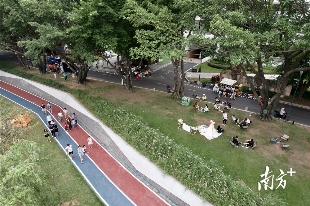 “华丽转身”后的鳒鱼洲文创园,成为了不少年轻人青睐的休闲胜地。晴朗朗的天里,不少摄影爱好者聚集在江岸,将蓝天映衬下的碧道草坪收入镜头;夜幕低垂,咖啡车开进林荫道两旁,1辆车、两三个棚,近20张座椅,由咖啡流动车搭建起的新型服务场景,引得市民纷纷消费体验。