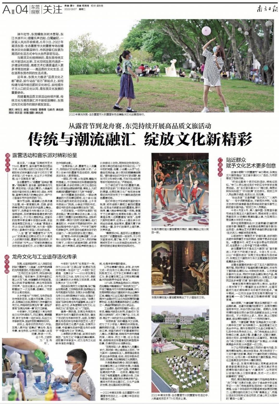 活动由东莞市文化馆统筹,除了整合东莞非遗、文旅特色资源,陆续推出龙舟月竞渡系列活动、东莞水乡非遗夜墟、龙舟文化进校园等线下体验,还推出了龙舟文化H5小程序线上体验、“非遗小姐姐”玩转东莞龙舟月直播等,线上线下联动,全方位、多角度展现龙舟文化,让传统文化“活”起来,也“火”了起来。