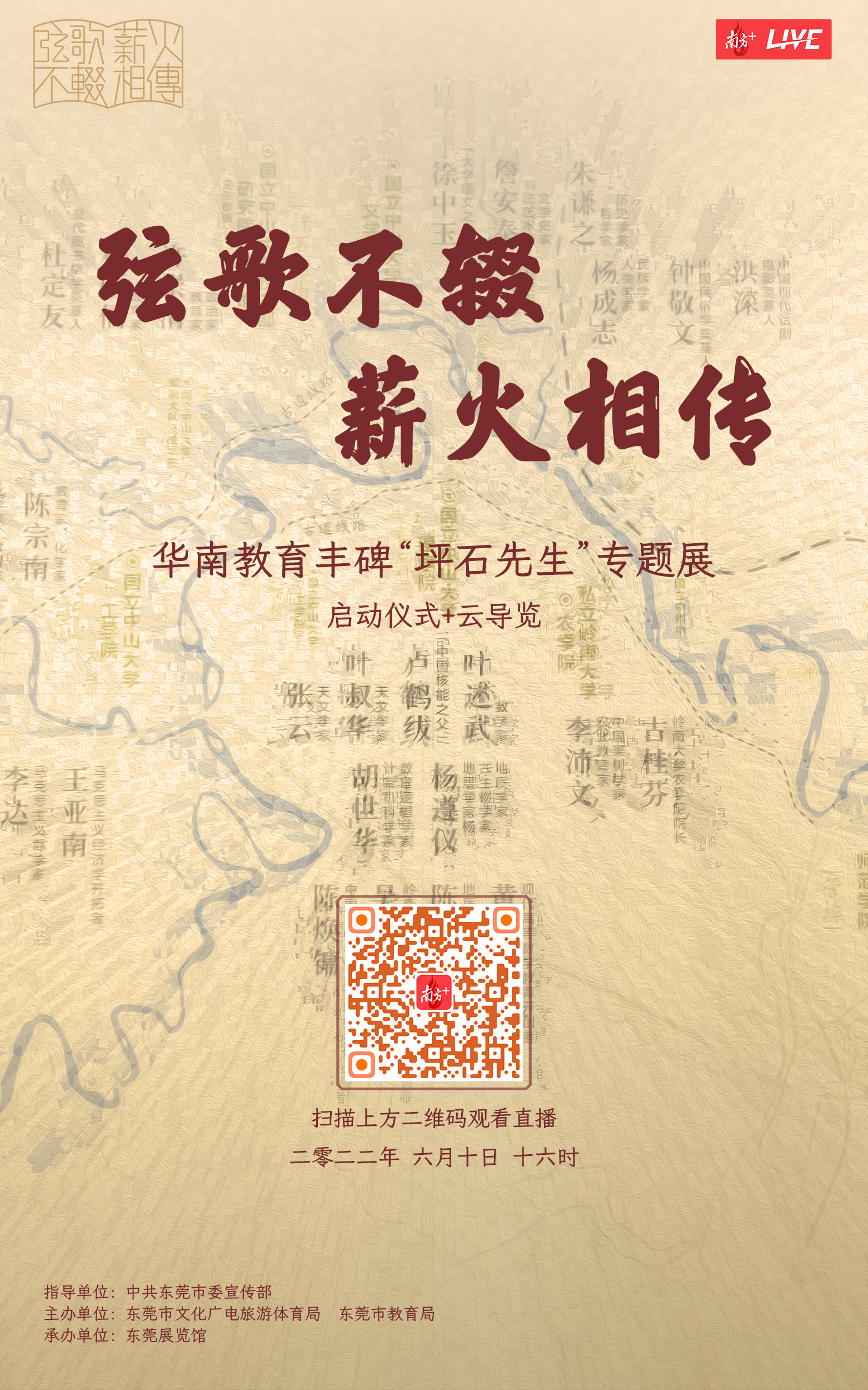 6月10日,由中共东莞市委宣传部指导,东莞市文广旅体局、东莞市教育局主办,东莞展览馆承办,东莞图书馆、东莞玉兰大剧院管委会协办的《弦歌不辍 薪火相传——华南教育丰碑“坪石先生”专题展》在东莞展览馆三楼专题展厅开幕。