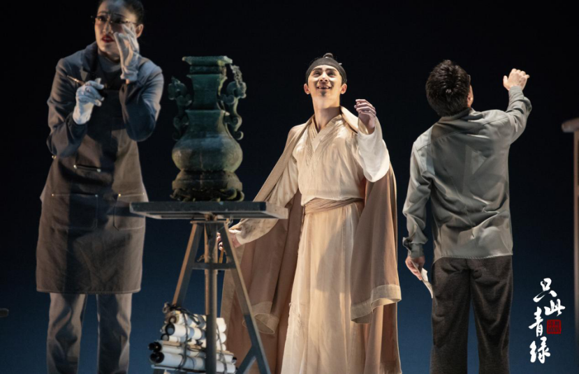 《只此青绿》把《千里江山图》创作、制作的工序,如制笔、制墨等传统技艺诗化呈现在舞台之上。“创作前我也看了很多纪录片,比如制墨的过程是什么样的,中间要反复地捶打。”吕亮听到了捶打的声音,“咚咚咚”,就把这些现实中的声音采集下来,放在音乐中。