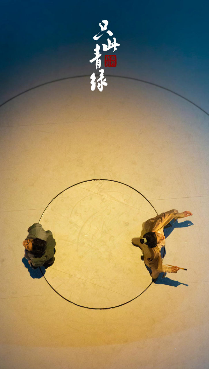 《只此青绿》的舞台,做了同心圆的巧妙设计,还原了中国传统画卷的“展卷”过程。画中,天地无边,山水无界,一切在行云流水间,悄然转化。圆环相扣,亦是时空相交。时间、空间、速度、过去、未来,彼此相互重叠。剧中,故宫的研究员正是站在这样的圆盘上,与千年前的希孟彼此对视、凝望。千年前的那个少年,倾尽毕生气力,“此画与天地共绘,往来者但见青绿足矣”的心愿,与展卷人穷尽一生,坚持守护与传承、探寻希孟内心的心愿,正在这皓月千里的某一刻,重叠、相通。