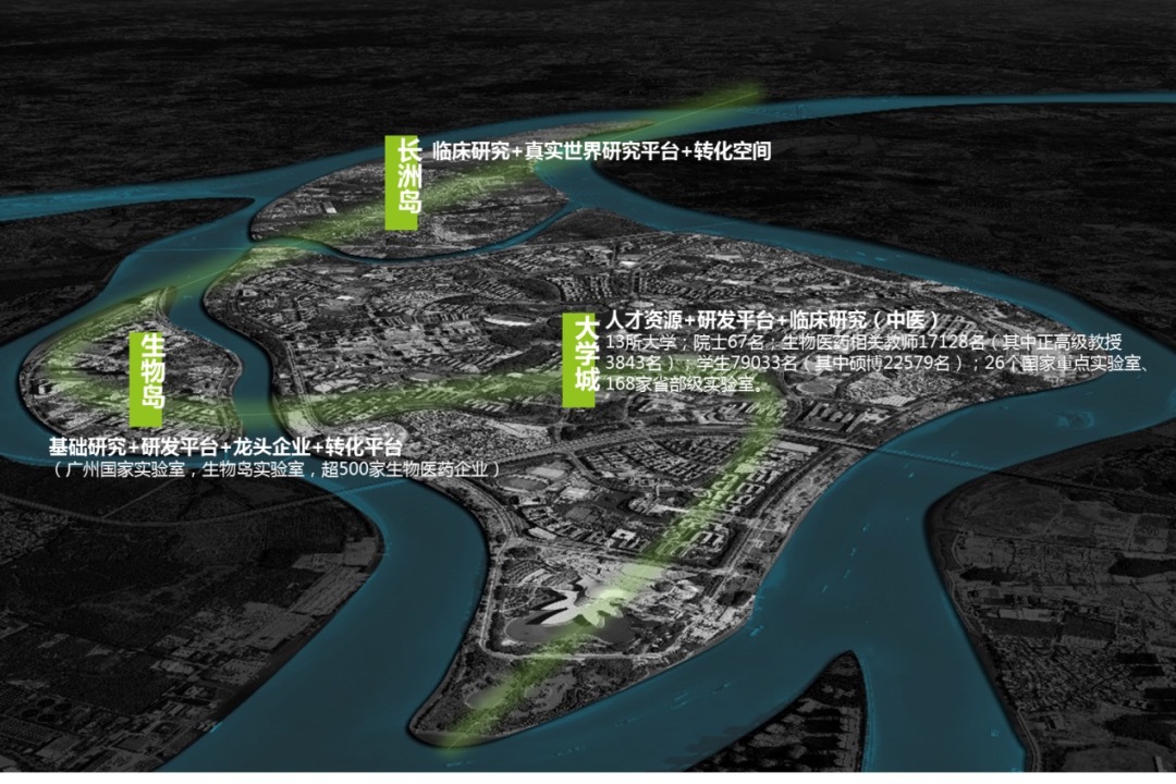 生物岛,珠江之畔的都市绿岛,集绿色生态、岭南文化、智慧科技于一体。既保留了珠江河口独特景观,又传承了岭南园林艺术,更成为生物医药研究沃土与科技创新平台。通过强化和完善全岛高度错落的天际线设计,重点设计环岛滨水四大特色门户,提升入岛体验及视觉印象。以江心绿岛环境、岭南文化及城市辐射优势,塑造生物医药产业服务与创新的新名片。