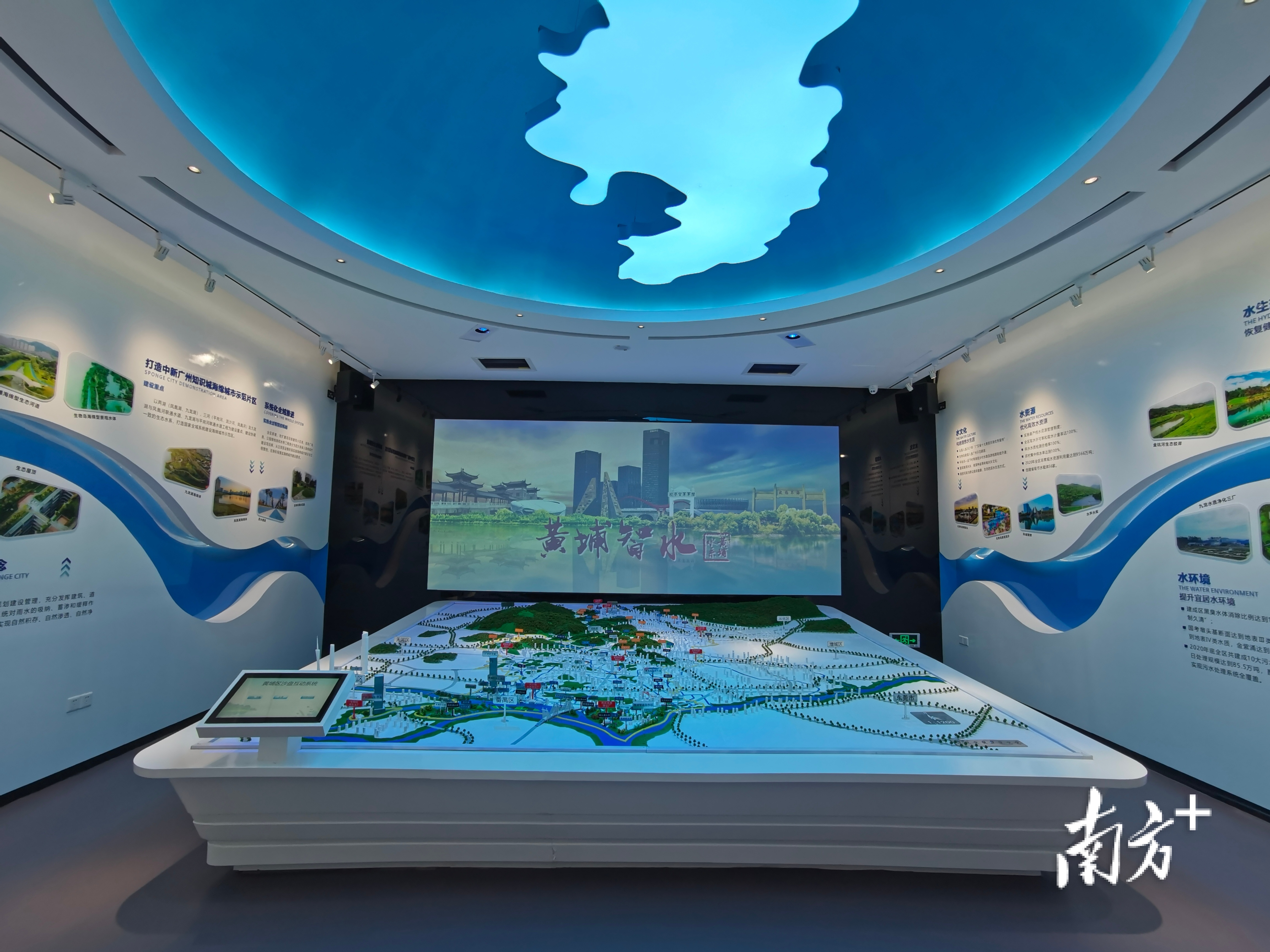 以“黄埔·智水”为主题的黄埔区水系展览馆,集中展示了黄埔区近年来的治水工作成果。“黄埔水脉变迁”展区以珍贵史料和黄埔水系历代图片,讲述了南海神庙、扶胥古运河、黄埔港等黄埔“水故事”;主体部分视频和沙盘形象地展示了黄埔区近年来“水安全”“水环境”“水资源”“水生态”“水文化”等领域取得的工作成果。而展厅出口展区则展现了黄埔区碧道和海绵城市规划建设的情况,可通过互动屏查看黄埔“三脉一湾”碧道的规划图和实景照片;通过再生水厂介绍展区,了解污水是如何经过处理实现再生循环利用的。
