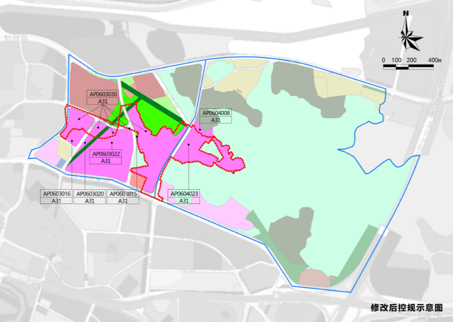 同时,为保持用地完整性,划分后新增AP0603030地块(157419平方米)和AP0604023地块(81620平方米)。总用地面积不变。