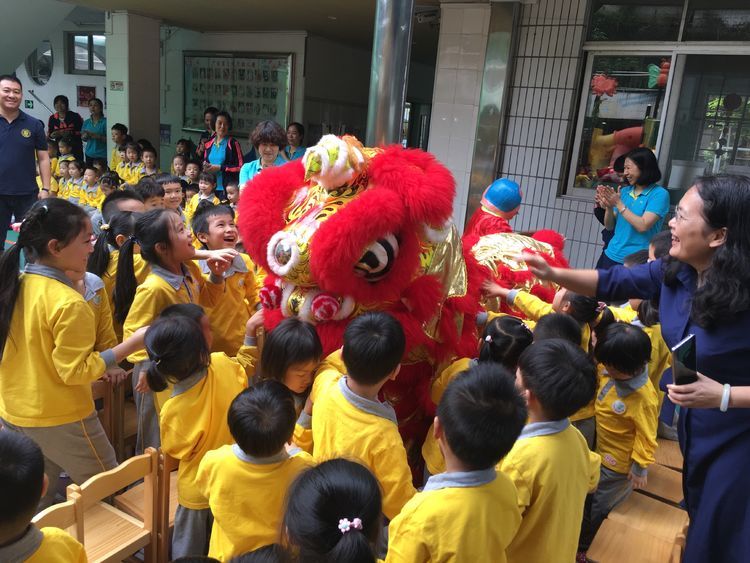 赵老师循循善诱,告诉孩子们醒狮是吉祥物,神话了的狮子,它驱邪避害,为人们带来吉祥如意,并分步讲解醒狮每个部位的寓意:“摸摸狮子头是‘鸿运当头’,摸摸狮子耳朵是‘耳聪目明’,摸摸狮子舌头是‘大吉大利’,从狮头摸到狮尾就是‘一年顺到尾’。”两头可爱的醒狮走到孩子中间,大家都迫不及待地和它们来了个“亲密接触”。