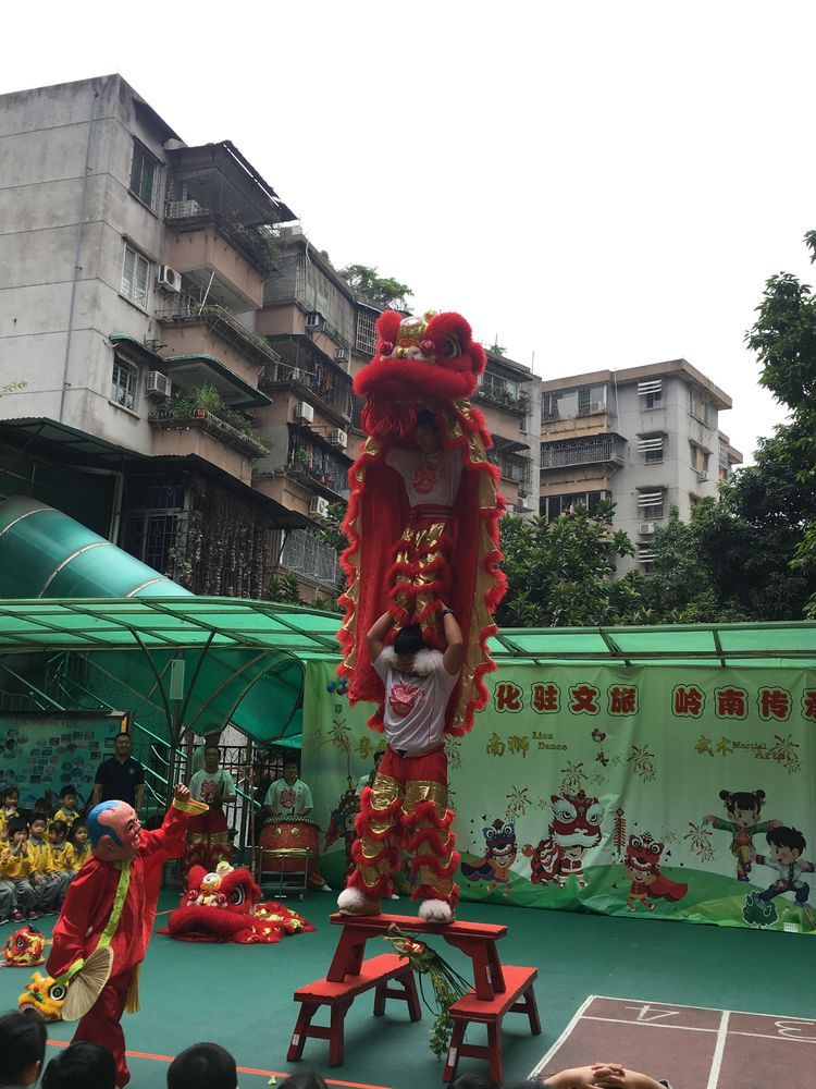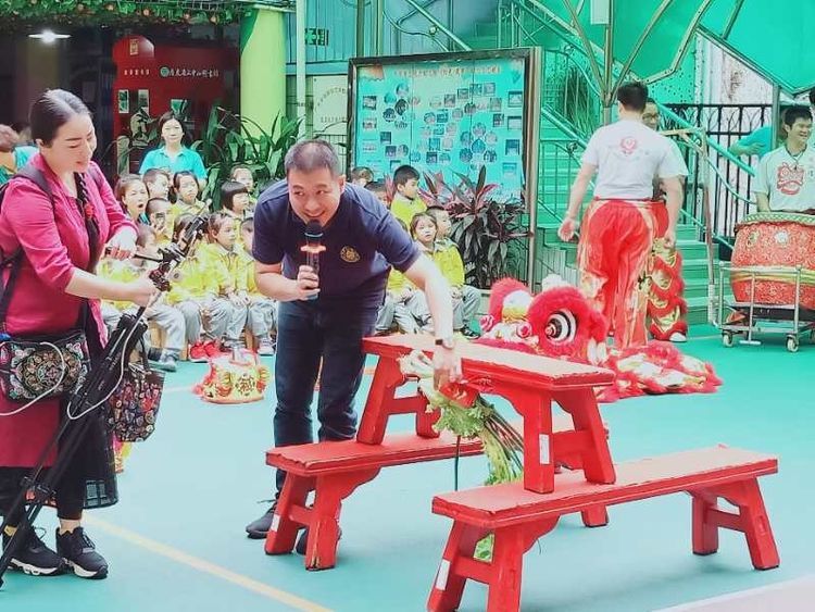 “你们想不想舞醒狮呀?”“想!”一群可爱的小朋友争先恐后地回答。大家搬好小凳子排排坐,兴致勃勃地期待醒狮表演的开锣。伴随着阵阵锣鼓声,“大头佛”引领着两头炯炯有神的红色狮子进场,立时吸引全场目光。狮子时而腾空跃起,时而回旋下探,舌间吐出“文化传承,发扬光大”的对联,让孩子和老师们看得目不转睛,不时激动得拍手叫好。