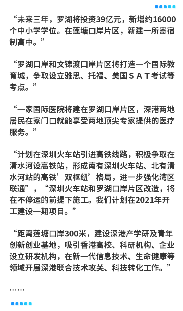 其中,口岸经济带目前已经上升为全市战略。“为实现错位发展,我们将以民生合作为主,重点打造国际教育城、国际医疗城、深港青年创新创业基地。”周小建说。