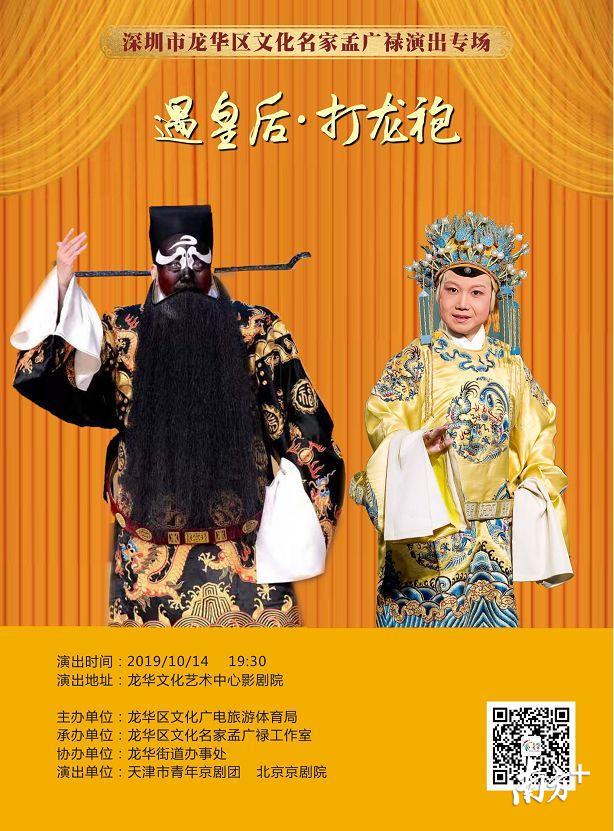 10月14日(星期一)上午10:30,龙华区文化名家孟广禄工作室将正式揭牌。同期,深圳市龙华区京剧院揭牌仪式暨非遗进校园演出活动也将举行。