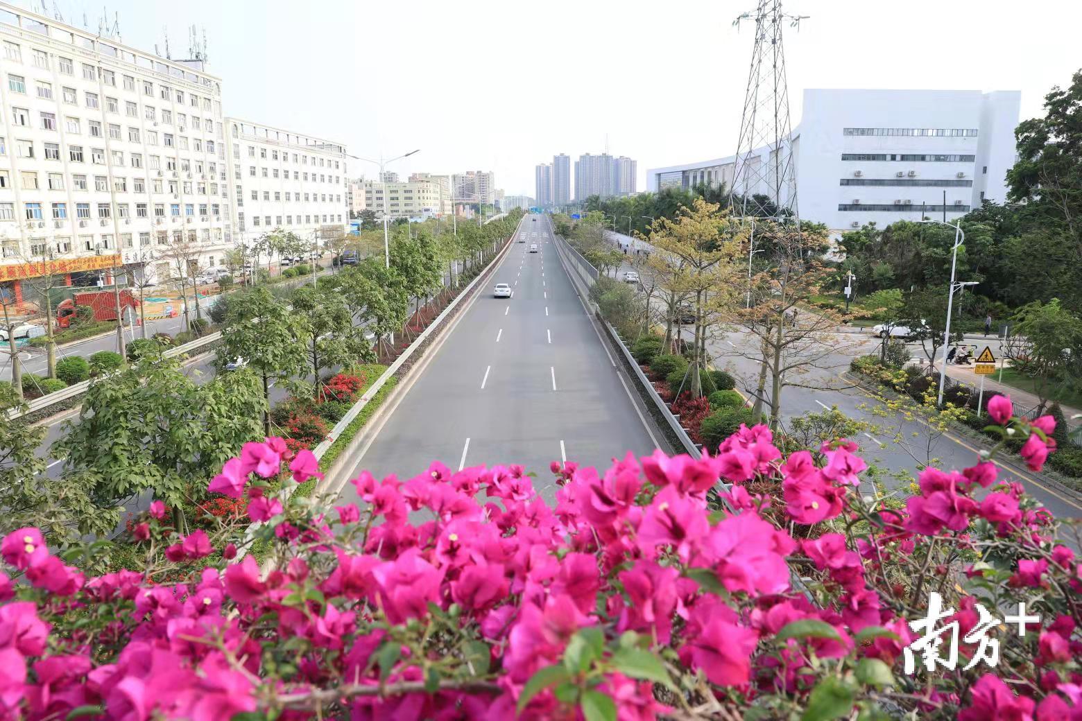 绿化带里,城市管理工作者们特意将一簇簇盛开的簕杜鹃移植了过来,玫瑰红、加州蓝、深紫……如同一丛丛熊熊火焰,点燃了福城街头巷尾、园区的热情。