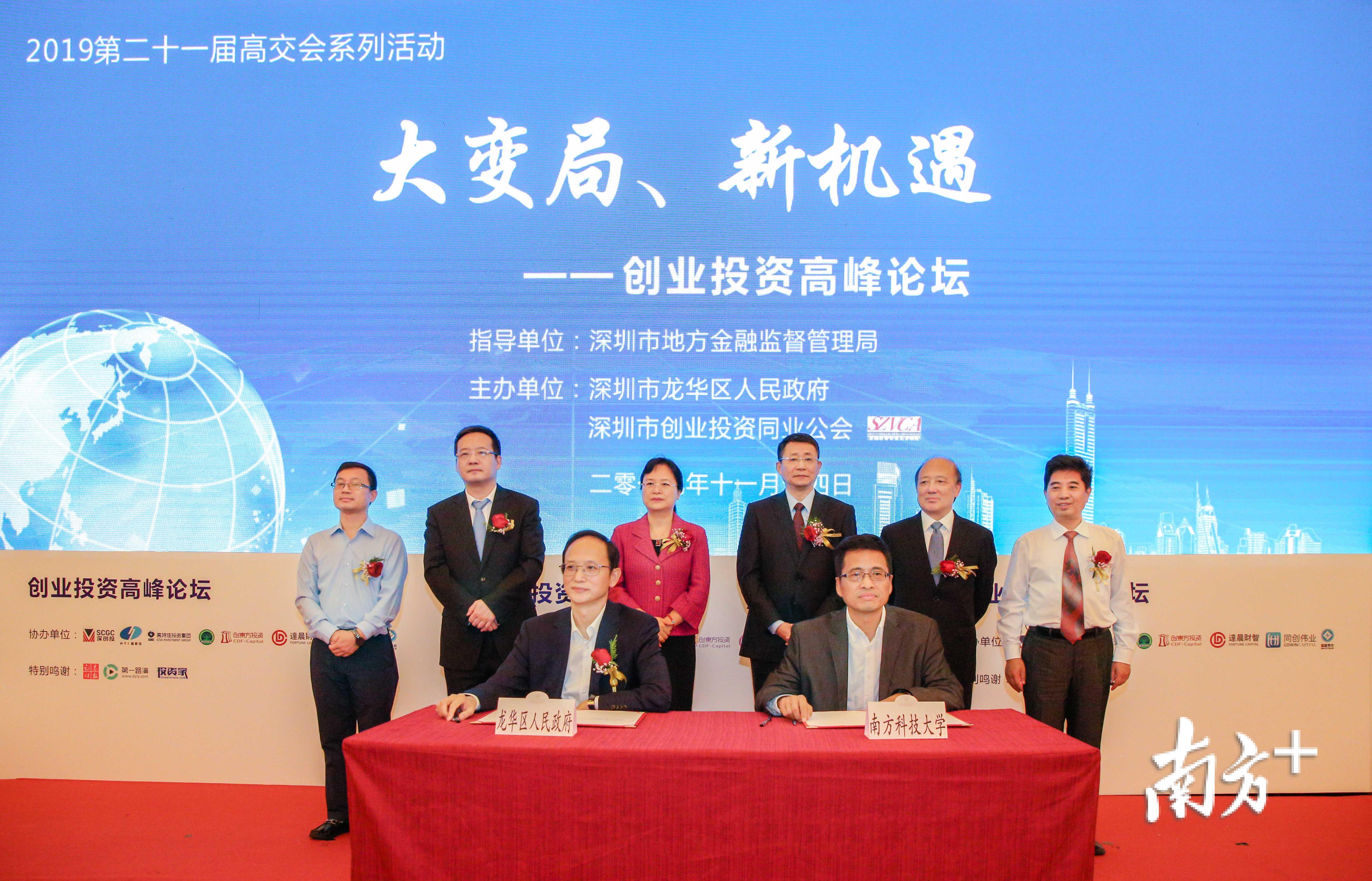 11月14日上午,由龙华区人民政府和深圳市创业投资同业公会主办的“大变局、新机遇”创业投资高峰论坛拉开帷幕。龙华区副区长陈建民代表龙华区人民政府与南方科技大学签订战略合作协议,双方计划在科技、产学研、教育、人才团队引进等领域开展全方位合作交流。