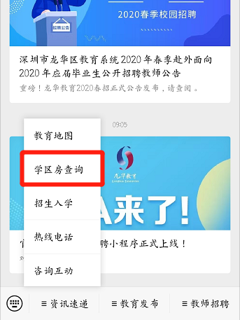 学区房锁定情况可通过“龙华教育”微信公众号—“资讯速递”—“学区房查询”自助查询。查询操作如下 :