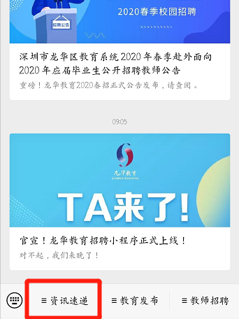 1)进入“龙华教育”公众号,点击“资讯速递”;