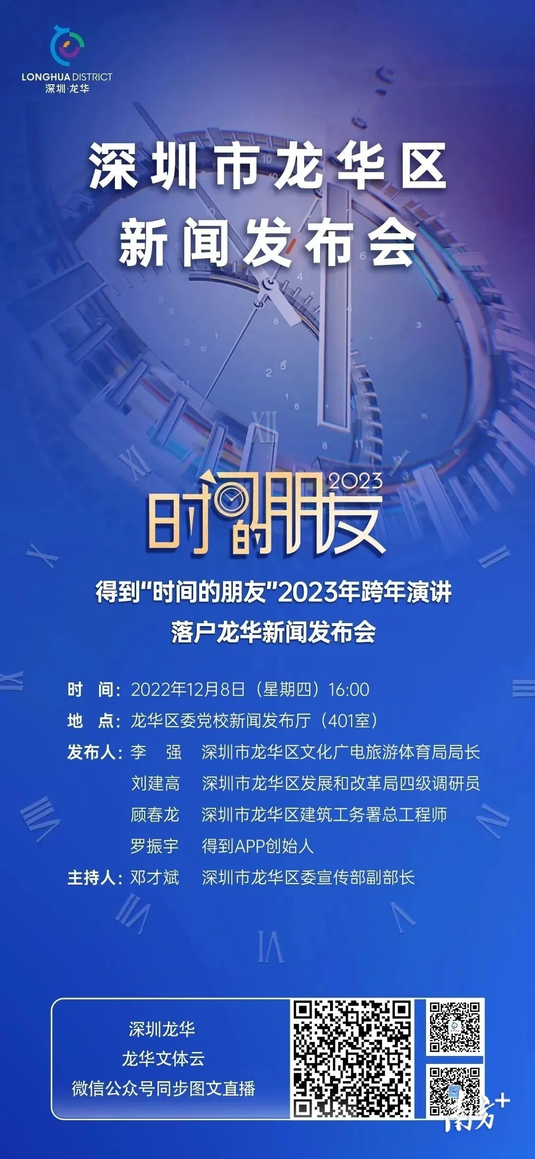 12月8日下午,深圳市龙华区举办得到“时间的朋友”2023年跨年演讲落户龙华新闻发布会,介绍了本次活动的相关信息及龙华区文体事业高质量发展等内容。得到APP创始人罗振宇,龙华区委宣传部副部长邓才斌,龙华区文化广电旅游体育局局长李强,龙华区发展和改革局四级调研员刘建高,龙华区建筑工务署总工程师顾春龙出席发布会。