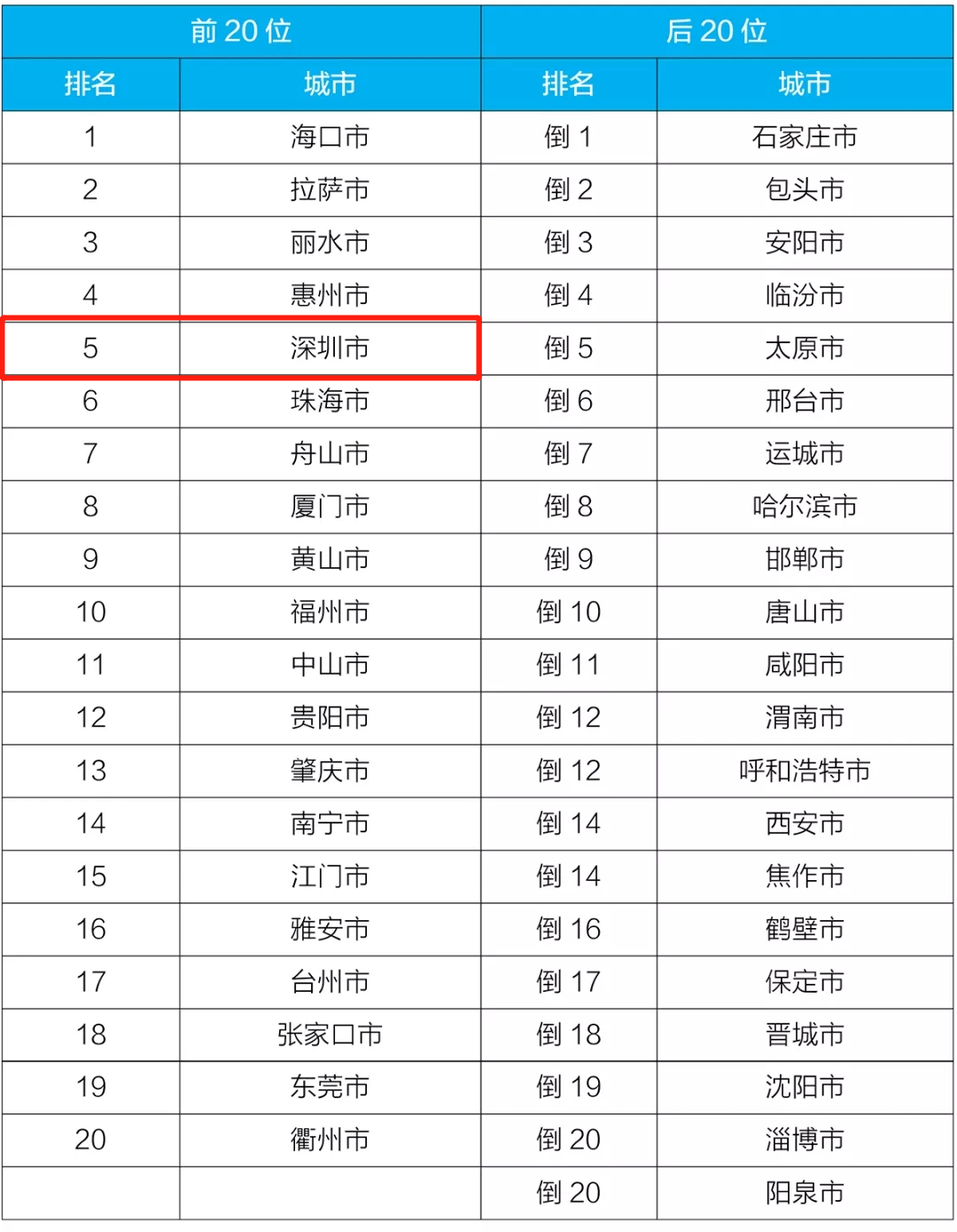 深圳4月空气质量在全国168个重点城市中排名第12,1-4月空气质量全国排名第5。