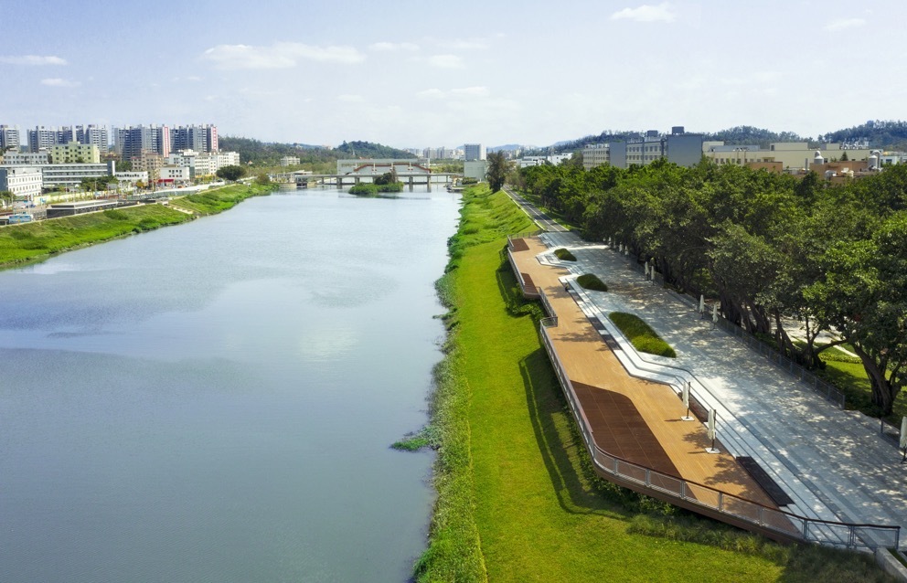 河两岸草木葱茏、绿道蜿蜒