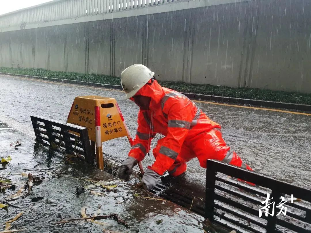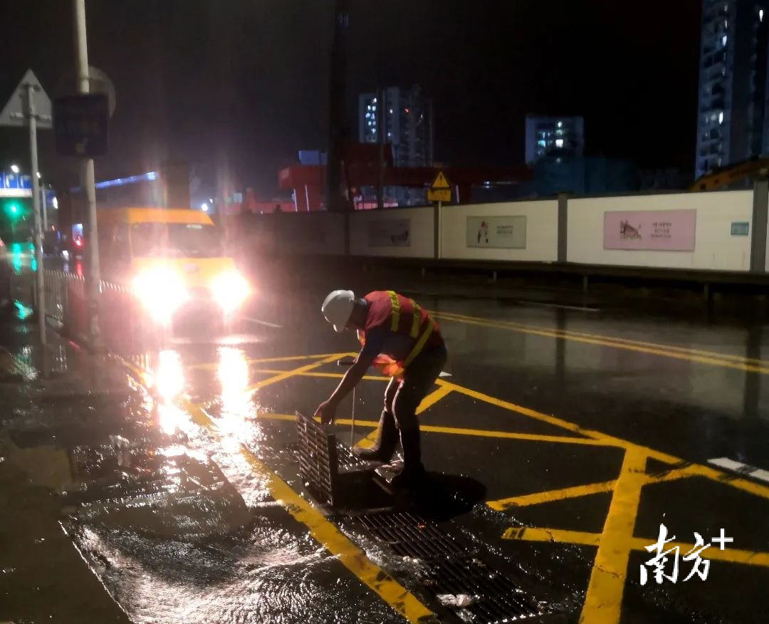 深圳市环水集团盐田分公司值守人员打开雨水篦子,检查排水情况。