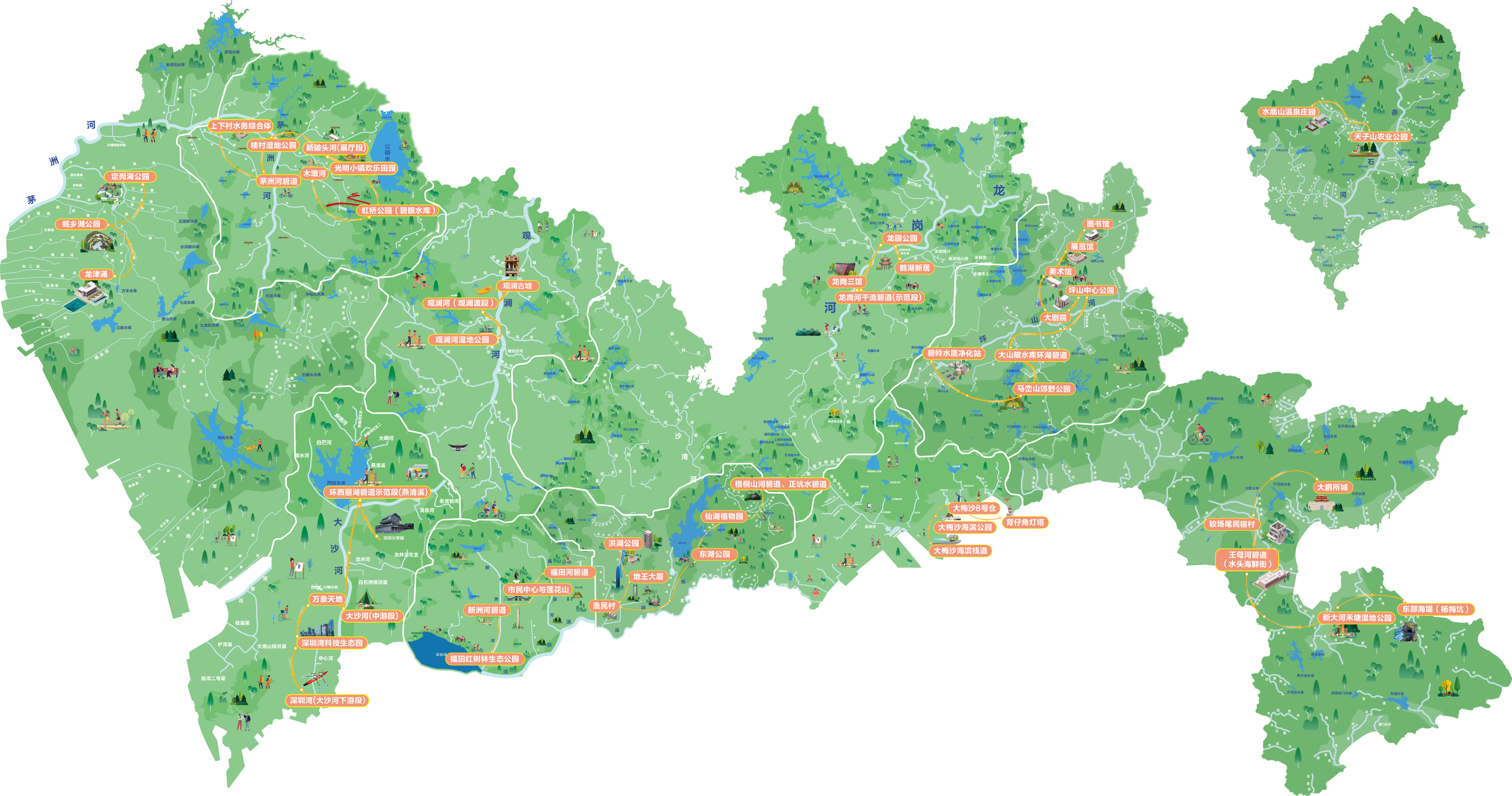 福田区的“城市绿洲线”,罗湖区的“湖光山色线”,盐田区的“通山达海城线”,南山区的“湾区生态线”,宝安区的“海川兴城线”,龙岗区的“客家水岸线”,龙华区的“观古通澜线”,坪山区的“自然博物线”,光明区的“科学生态线”,大鹏新区的“山海生态线”,深汕特别合作区的“美丽田园线”以及“一滴水的旅行”特色线……从水清岸绿的视觉享受到与水共游的精神愉悦,深圳治水2.0版本的蓝图由此徐徐展开。
