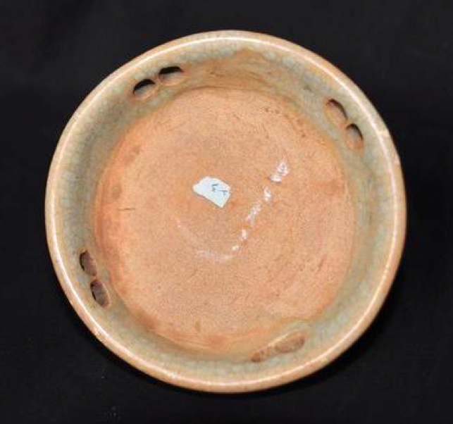 类似的水车窑砚台在当地唐墓中并不少见。梅县南口镇锦鸡村也出土过一款可“双面”用的青釉镂孔圈足瓷砚。这个砚台呈平底圆盘形,圈壁上有4对双圆孔,盘沿与砚面间有一道浅凹槽,砚面和盘底都不施釉,方便磨墨储墨。