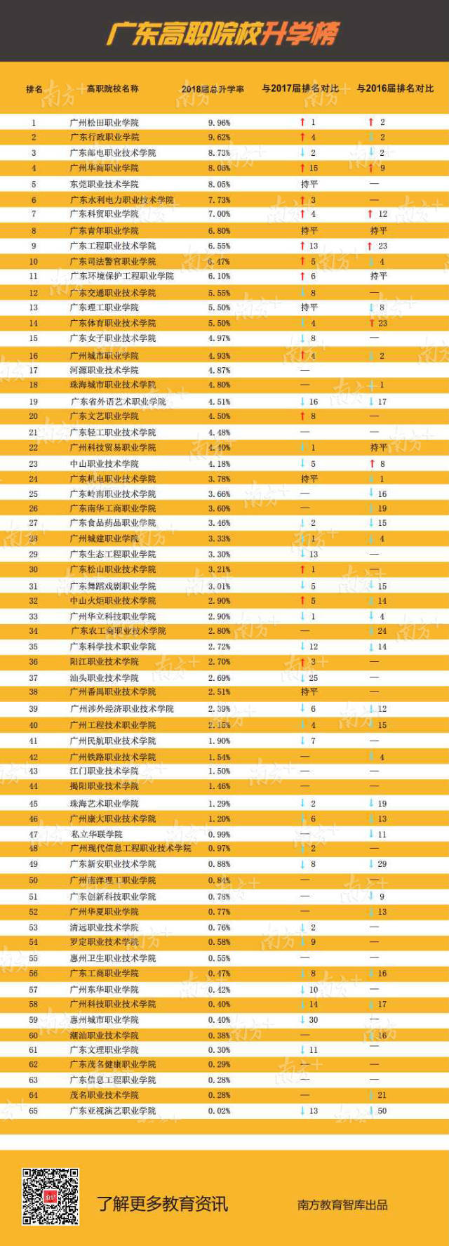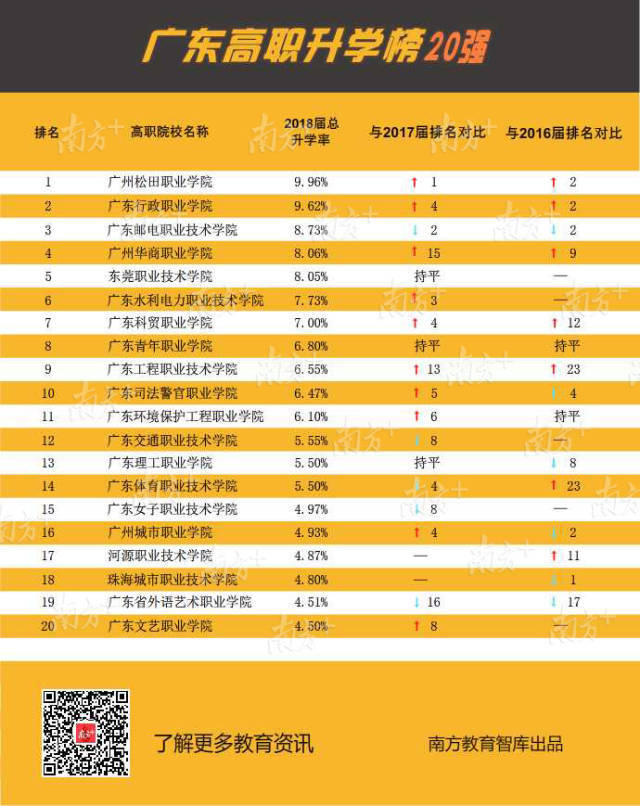 近3年各高职升学数据显示,越来越多毕业生通过升学提升自身竞争力,尤其2018届升学率增长明显。其中有7所高职院校的毕业生升学率达到或超过7%,分别是广州松田职业学院9.96%、广东行政职业学院9.62%、广东邮电职业技术学院8.73%、广州华商职业学院8.06%、东莞职业技术学院8.05%、广东水利电力职业技术学院7.73%和广东科贸职业学院7.00%。