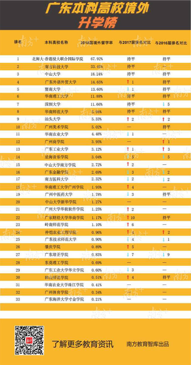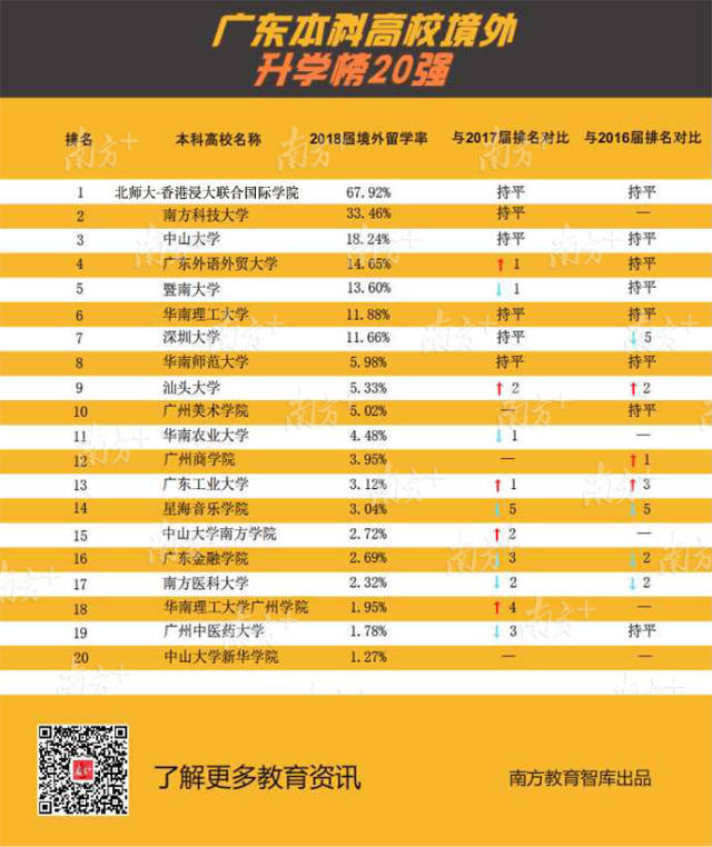 广东外语外贸大学境外留学人数显著提升,2018届共有275人升入世界排名前100名的高校深造。两所内地与香港合作创办的大学在境外留学率上处于全省前列。北京师范大学-香港浸会大学联合国际学院持续多年保持全省第1位,此次共有811人留学,其中481人就读世界前100名的大学。香港中文大学(深圳)仅公布总升学率65.67%,该校就业处相关负责人介绍,升学率中绝大部分是境外留学,176名学生平均每人收到3份世界知名大学录取通知书。