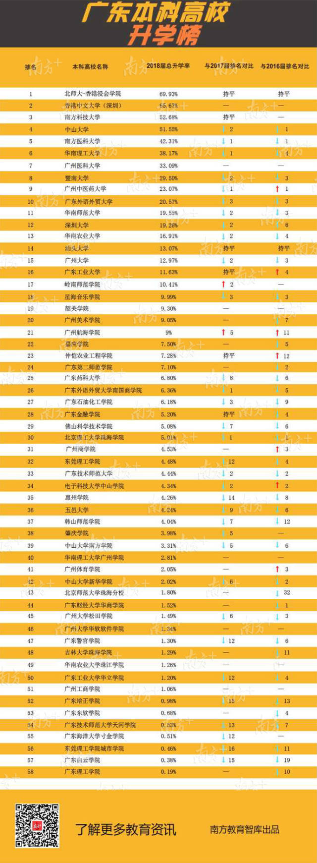 今天南方教育智库继续独家推出广东高校“升学榜”,梳理全省123所高校发布的《2018年毕业生就业质量年度报告》的关键数据,聚焦毕业生的深造路径和升学比例。其中南方医科大学、中山大学、广州医科大学本科毕业生国内升学率位列前3名,均超过33%。