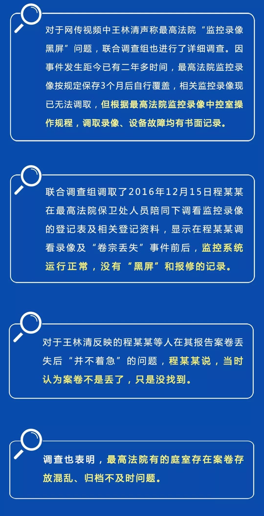 对于网传视频中王林清声称最高法院“监控录像黑屏”问题,联合调查组也进行了详细调查。因事件发生距今已有2年多时间,最高法院监控录像按规定保存3个月后自行覆盖,相关监控录像现已无法调取,但根据最高法院监控录像中控室操作规程,调取录像、设备故障均有书面记录。联合调查组调取了2016年12月15日程某某在最高法院保卫处人员陪同下调看监控录像的登记表及相关登记资料,显示在程某某调看录像及“卷宗丢失”事件前后,监控系统运行正常,没有“黑屏”和报修的记录。对于王林清反映的程某某等人在其报告案卷丢失后“并不着急”的问题,程某某说,当时认为案卷不是丢了,只是没找到。调查也表明,最高法院有的庭室存在案卷存放混乱、归档不及时问题。综合上述情况,联合调查组认为,王林清的口述及相关调查材料能印证其窃取相关材料的事实,监控录像问题不影响调查结论。