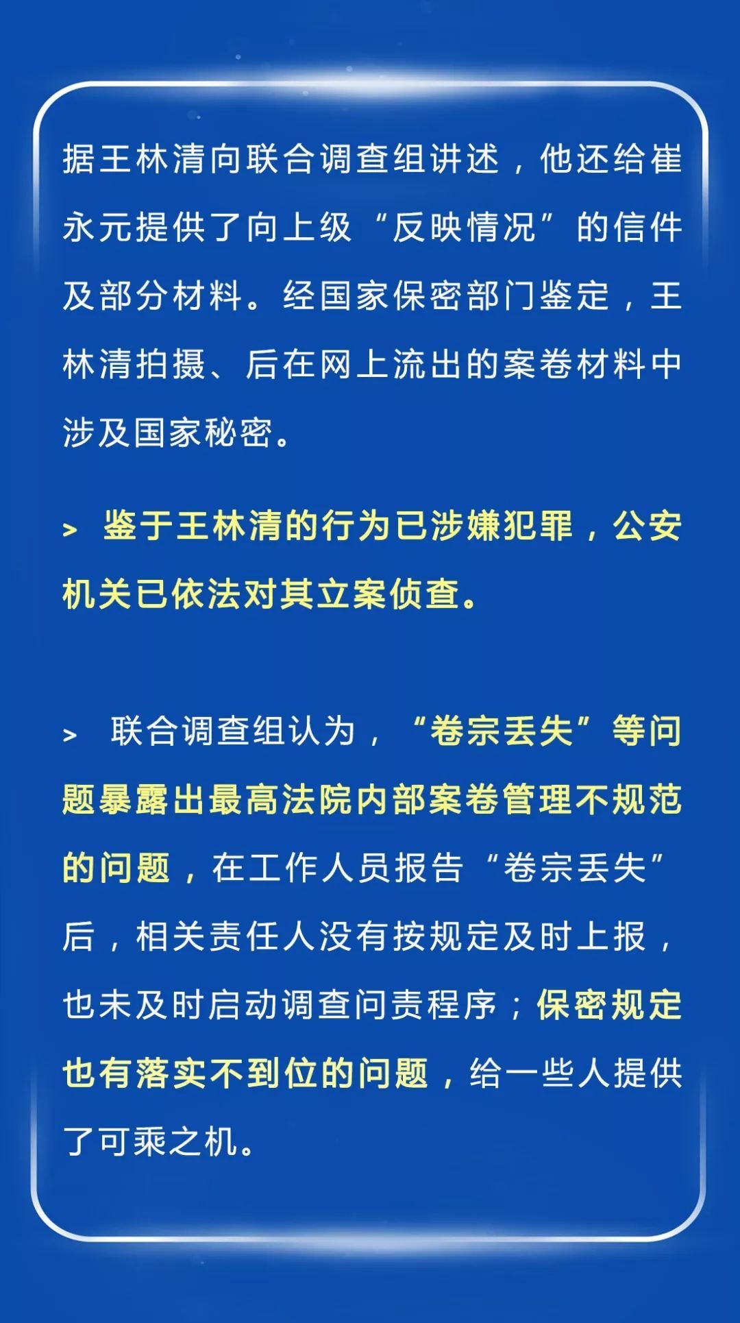 调查还发现,崔永元在网上发布的最高法院相关副卷材料也来源于王林清。王林清被调出合议庭后,无权调阅该案案卷材料。2018年8月,王林清谎称经程某某同意,从书记员李某某处骗取了案卷副卷,并用手机偷拍了部分材料,通过微信发给赵发琦;2018年12月28日,崔永元将相关内容在互联网上发布。据王林清向联合调查组讲述,他还给崔永元提供了向上级“反映情况”的信件及部分材料。经国家保密部门鉴定,王林清拍摄、后在网上流出的案卷材料中涉及国家秘密。鉴于王林清的行为已涉嫌犯罪,公安机关已依法对其立案侦查。