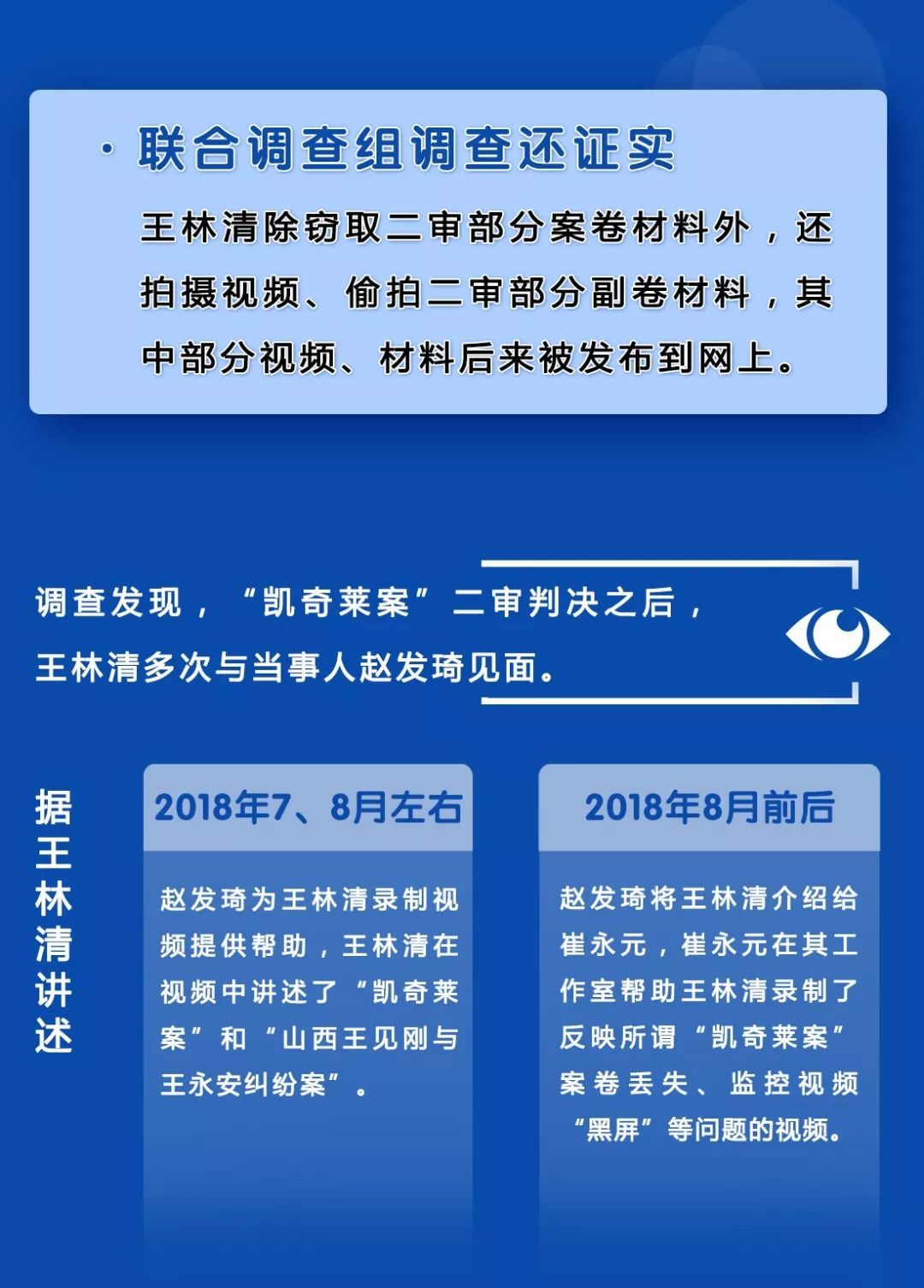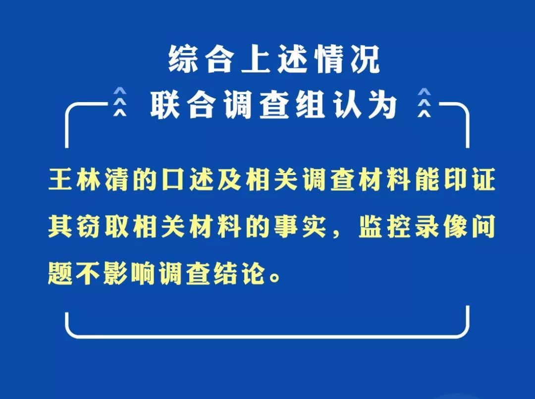 联合调查组的调查还证实,王林清除窃取二审部分案卷材料外,还拍摄视频、偷拍二审部分副卷材料,其中部分视频、材料后来被发布到网上。