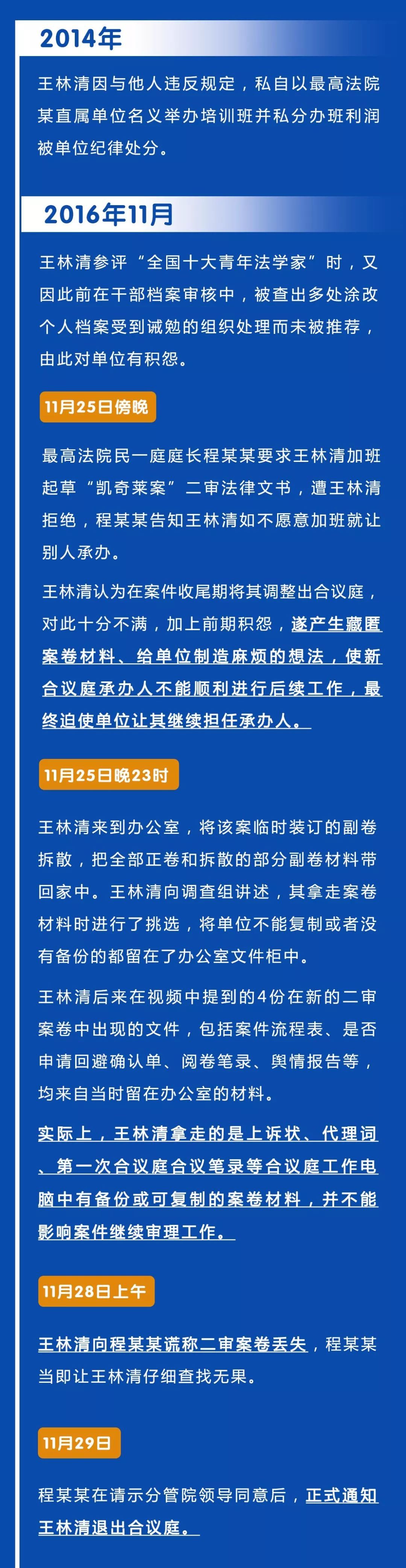 王林清在“凯奇莱案”当事人赵发琦于2011年上诉到最高法院后,担任该案二审合议庭的承办人。2014年,王林清因与他人违反规定,私自以最高法院某直属单位名义举办培训班并私分办班利润被单位纪律处分;2016年11月参评“全国十大杰出青年法学家”时,又因此前在干部档案审核中,被查出多处涂改个人档案受到诫勉的组织处理而未被推荐,由此对单位有积怨。2016年11月25日傍晚,最高法院民一庭庭长程某某要求王林清加班起草“凯奇莱案”二审法律文书,遭王林清拒绝,程某某告知王林清如不愿意加班就让别人承办。王林清认为在案件收尾期将其调整出合议庭,对此十分不满,加上前期积怨,遂产生藏匿案卷材料、给单位制造麻烦的想法。据调查,王林清于当晚23时许来到办公室,将该案临时装订的副卷拆散,把全部正卷和拆散的部分副卷材料带回家中。王林清向调查组讲述,其拿走案卷材料时进行了挑选,将单位不能复制或者没有备份的都留在了办公室文件柜中。王林清后来在视频中提到的4份在新的二审案卷中出现的文件,包括案件流程表、是否申请回避确认单、阅卷笔录、舆情报告等,均来自当时留在办公室的材料。