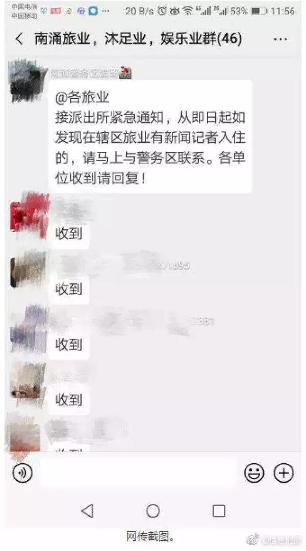 “即日起,如发现辖区旅业有新闻记者入住的,请马上与警务区联系。各单位收到请回复!”