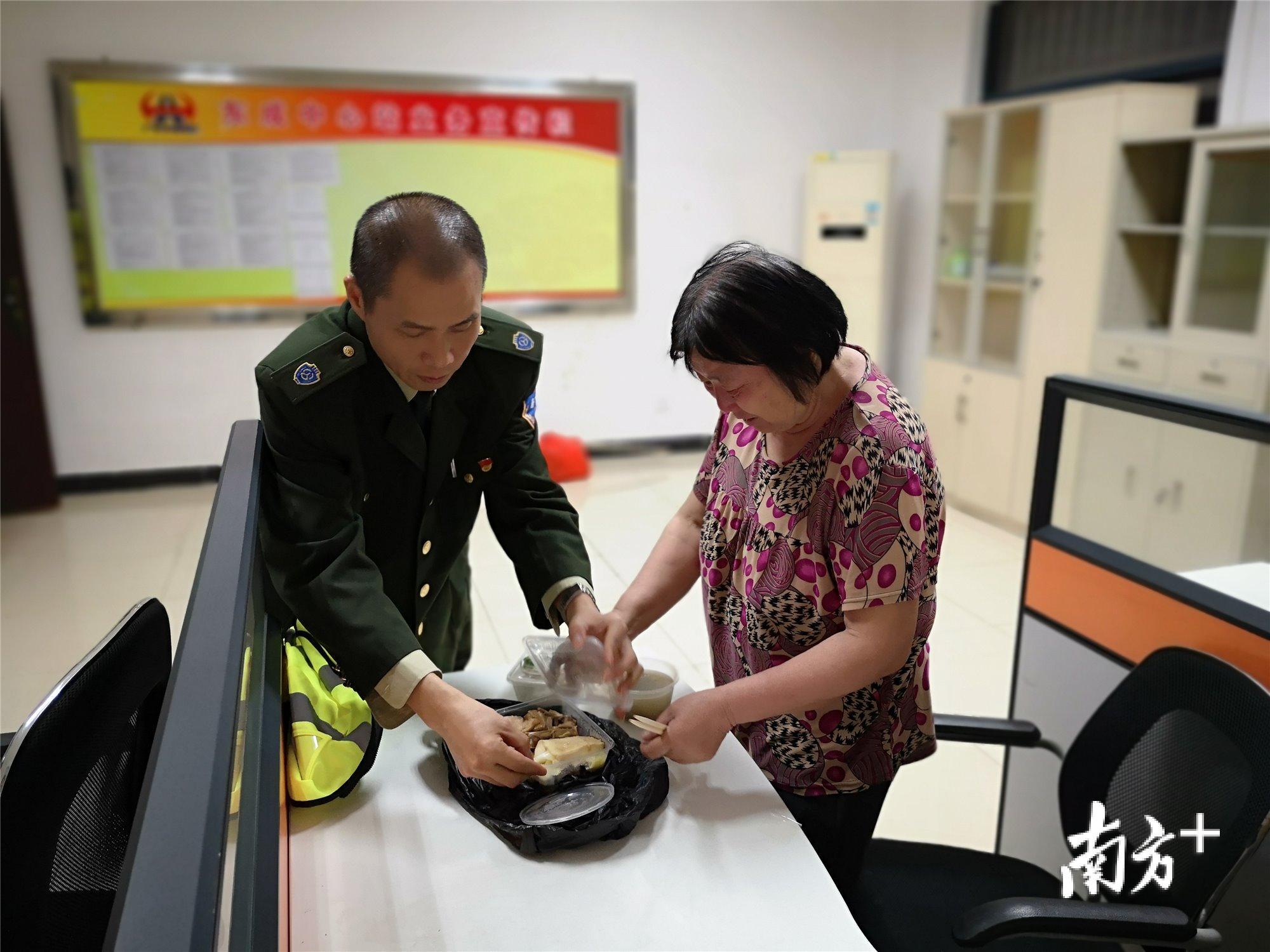 10分钟后,张志生赶到现场。看到老人着装单薄,瑟瑟发抖,神情恍惚,很是心痛。他马上给老人端上热腾腾的饭菜,老人看到“久违的晚饭”情绪控制不住,激动流泪致谢,“感谢你们,你们都是好人。”