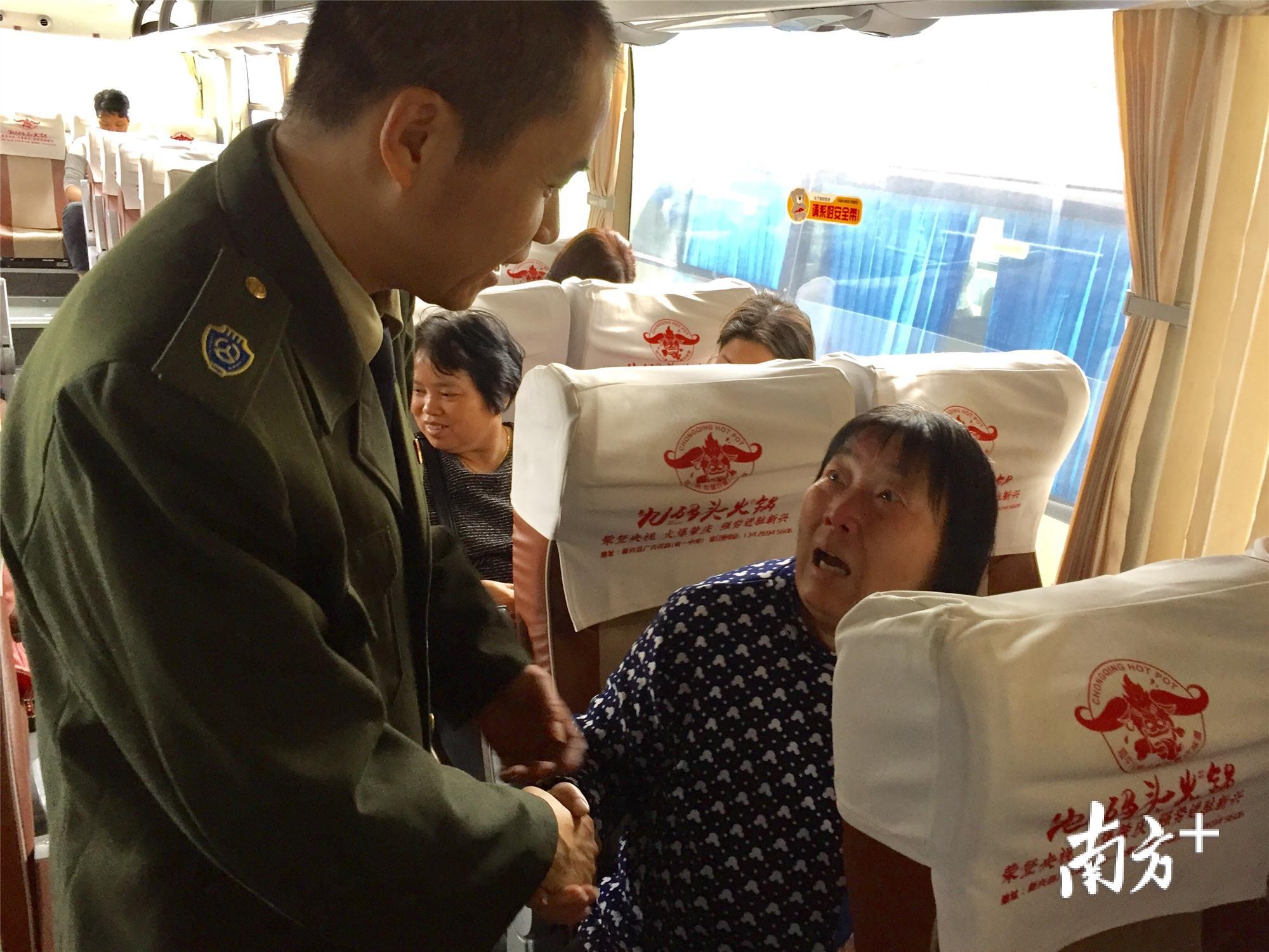 10点50分,开往广州的班车开始验票,就在张志生送老人上车时,老人突然下跪,连声感谢。张志生连忙扶起老人,对老人说:“您不要这样,这都是我们应该做到的,您平安到家就是我们最大的愿望。”老人紧紧地握着张志生的手,迟迟未松开。发车的广播响起,张志生再次叮嘱老人,回到家要记得给他打电话报平安。