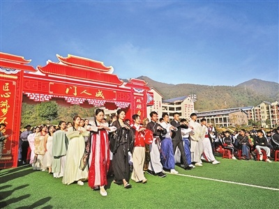 此次成人礼以“青春心向党 建功新时代”为主题,分为奏唱国歌,学生代表发言,家长、教师、学校领导寄语,击鼓鸣18响礼炮,跨越成人门,教师代表赠送成人手册及佩戴纪念徽章,成人宣誓等多个环节,通过一系列具有仪式感的流程,让青年们迎接“成人”这一人生重要里程碑的时刻。