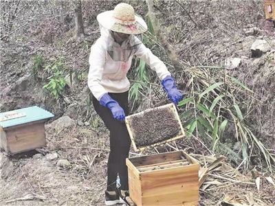 走进步郎村,原本幽静的绿色天然美景被“嗡嗡”的蜂鸣打破,禅蜜养殖专业合作社社员苏妹花头戴纱帽,在蜂箱旁忙碌着。苏妹花是村中的贫困户,靠山而居的她利用自家房前屋后的山地养蜂。“以前是自产自销,靠朋友宣传、代购,成立合作社后有了团队,大家一起交流、销售,效率高了,而且收入也更稳定了。”苏妹花告诉记者,这批共养了60箱,采一批蜂蜜500-600斤,平均售价50-70元/斤,按一年3次的采蜜期计算,年收入近4万元。