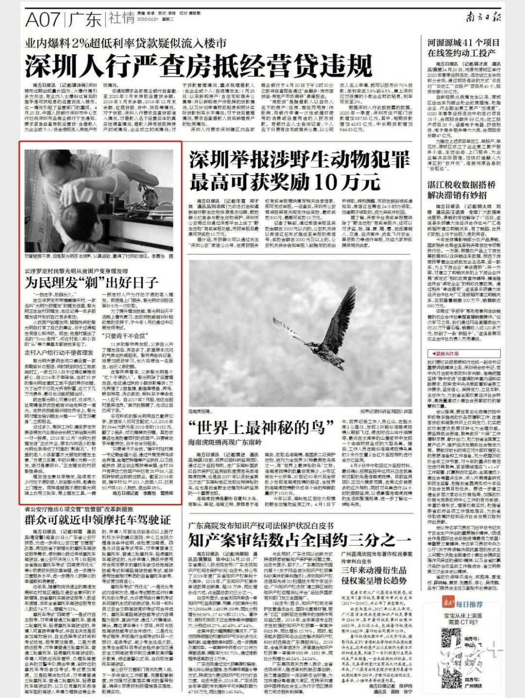 在云浮罗定市苹塘镇瑞平村,一家名叫“光明为民理发”的理发店里,黎光明正在给村民理发,他还记得一年多前理发店开张时自己有多激动。
