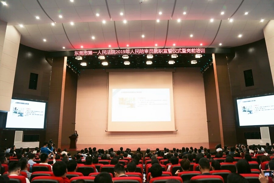 在东莞市第一法院就职宣誓仪式现场,东莞市人大常委会监察司法工委副主任李小敏宣读人民陪审员任命文件后,东莞市第一法院党组书记、院长陈葵等领导向人民陪审员代表颁发任命书。