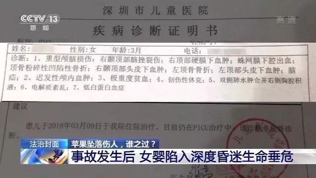 悲剧就发生在那一刹那,当住在24楼的奇奇听到“嘭”的声响后,那只高空坠落的苹果正好砸到了小梦凡的头部。事故发生后,小梦凡被紧急送到深圳市儿童医院进行救治。经医生诊断,小梦凡有重型颅脑损伤、顶骨粉碎性凹陷性骨折等症状,小梦凡陷入深度昏迷,几次生命垂危。