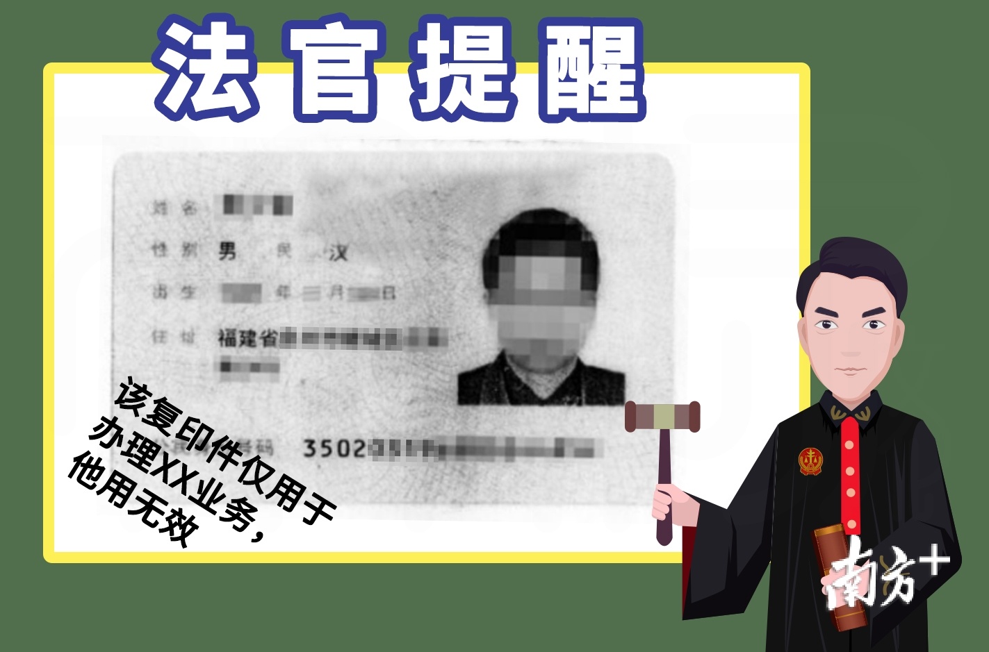 法官提醒,公民应妥善保管自己的身份证、驾驶证、护照等个人证件,避免丢失。一旦发现个人证件丢失或被盗,应及时挂失,尽快补领新证。个人在使用身份信息比如提交身份证复印件时,最好在身份证复印件上作一些备注标注。例如:该复印件仅限用于办理某某业务,写上“仅使用一次”、“再复印无效”等语句。