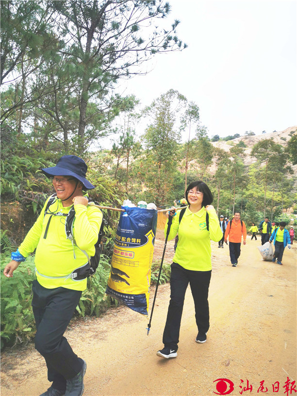 元旦当日,磨房汕尾组织志愿者服务队50多人到城区捷胜镇东坑水库和东坑村一带开展山野清洁活动,以实际行动践行“走过不留痕”的环保理念。图为志愿者把捡拾到的塑料瓶等垃圾抬到乡村垃圾收集点进行集中处理。