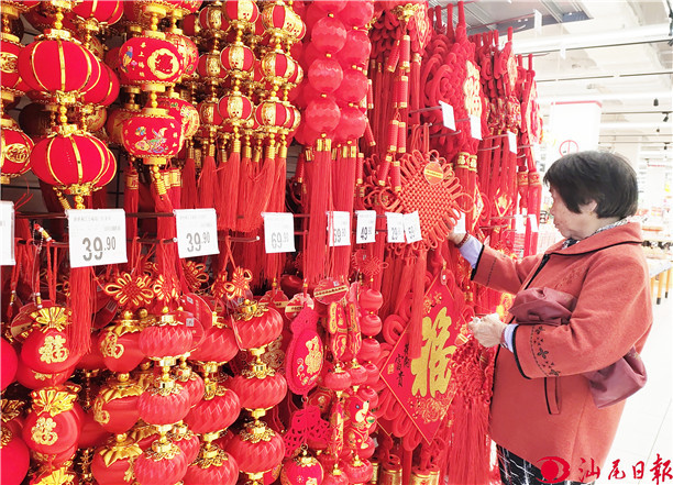 元旦当天,顾客在市区香洲路一家商场选购灯笼和中国结。春节临近,一些上班族利用元旦假期采购年货。有市民表示,用红红火火的灯笼和中国结装饰家庭更添新春喜庆。