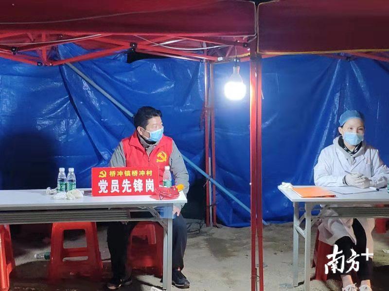 在镇村主干道和村综合市场设立疫情防控检测点,由村两委干部、工作队会同镇卫生院、派出所人员24小时轮班值守,开展村民健康检测宣传和来往车辆人员登记检测,劝阻外来人员返回,防止有疑似症状人员进入村内。陈少波组建桥冲村党员先锋队,设立党员先锋岗,并对村干部说:“晚上我们工作队上。”带着工作队员和其他党员同志一起在寒冷的夜里值守检测。
