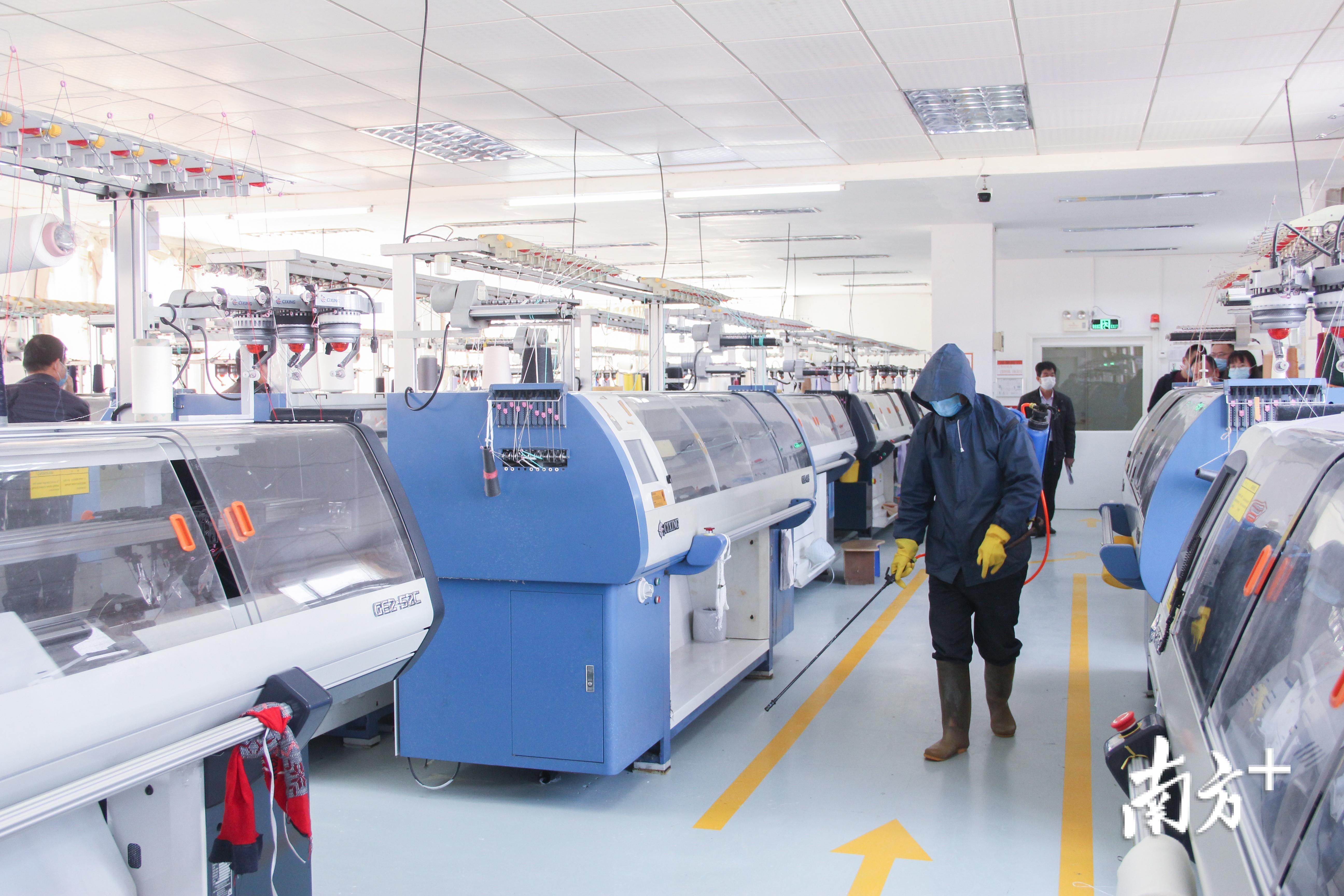 2月17日,位于汕尾市红海湾经济开发区的新辉针织时装有限公司内,佩戴着防护口罩的纺织工人正有条不紊地进行针织衣物的生产工作,还有工人正在对公共区域喷洒消毒液。