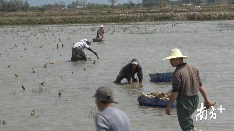 3月16日,在海丰县陶河镇亿源种养合作社的300多亩莲藕种植基地里,农户们正弓着腰忙着种植莲藕,浑浊的水面上,留下一行行水痕,荡漾着播种的新希望。