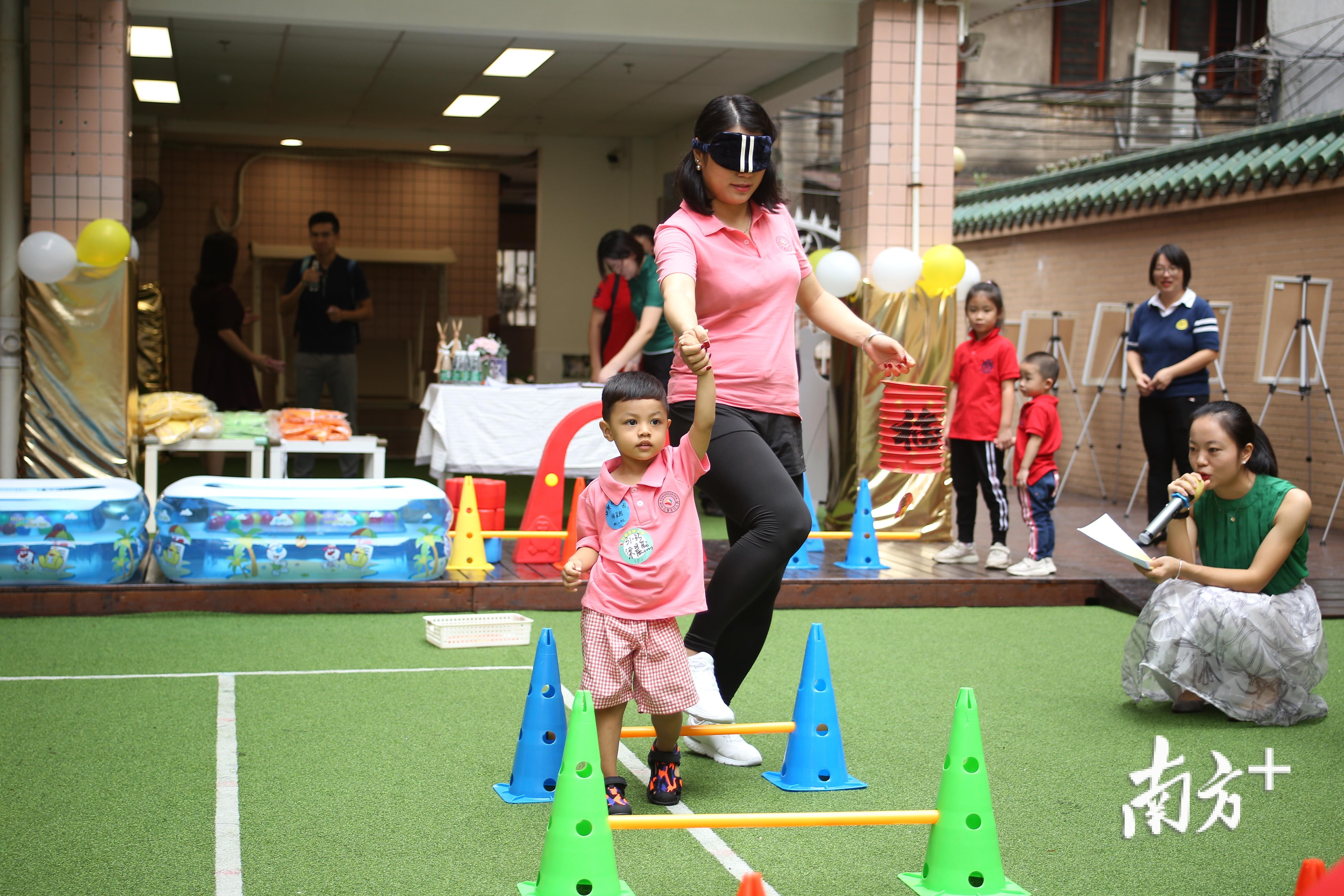在“大红灯笼高高挂”游戏中,妈妈被蒙上眼睛,在孩子的指引下跨越栏杆、绕过障碍,把灯笼交到孩子手中。而孩子则要在爸爸的帮助下,把灯笼挂到终点处的小树上。通过游戏,孩子们充分锻炼了手眼协调、空间认知、身体平衡等能力,亲子间的感情也更为深厚了。
